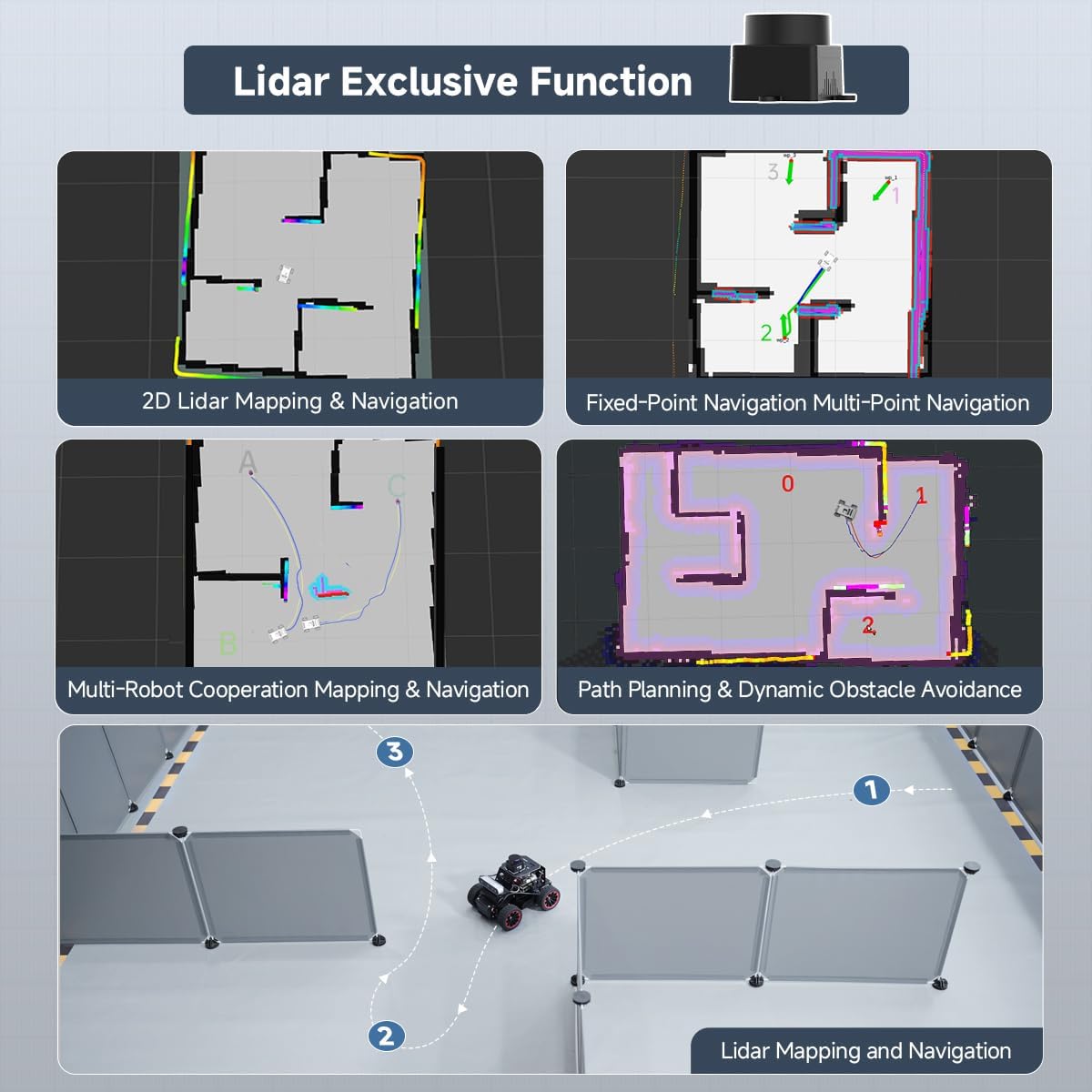 - With TOF Lidar & 3D Depth Camera for Advanced AI Capabilities. Supports SLAM mapping, path planning, multi-robot coordination, vision recognition, target tracking, and more, covering a wide range of AI applications.