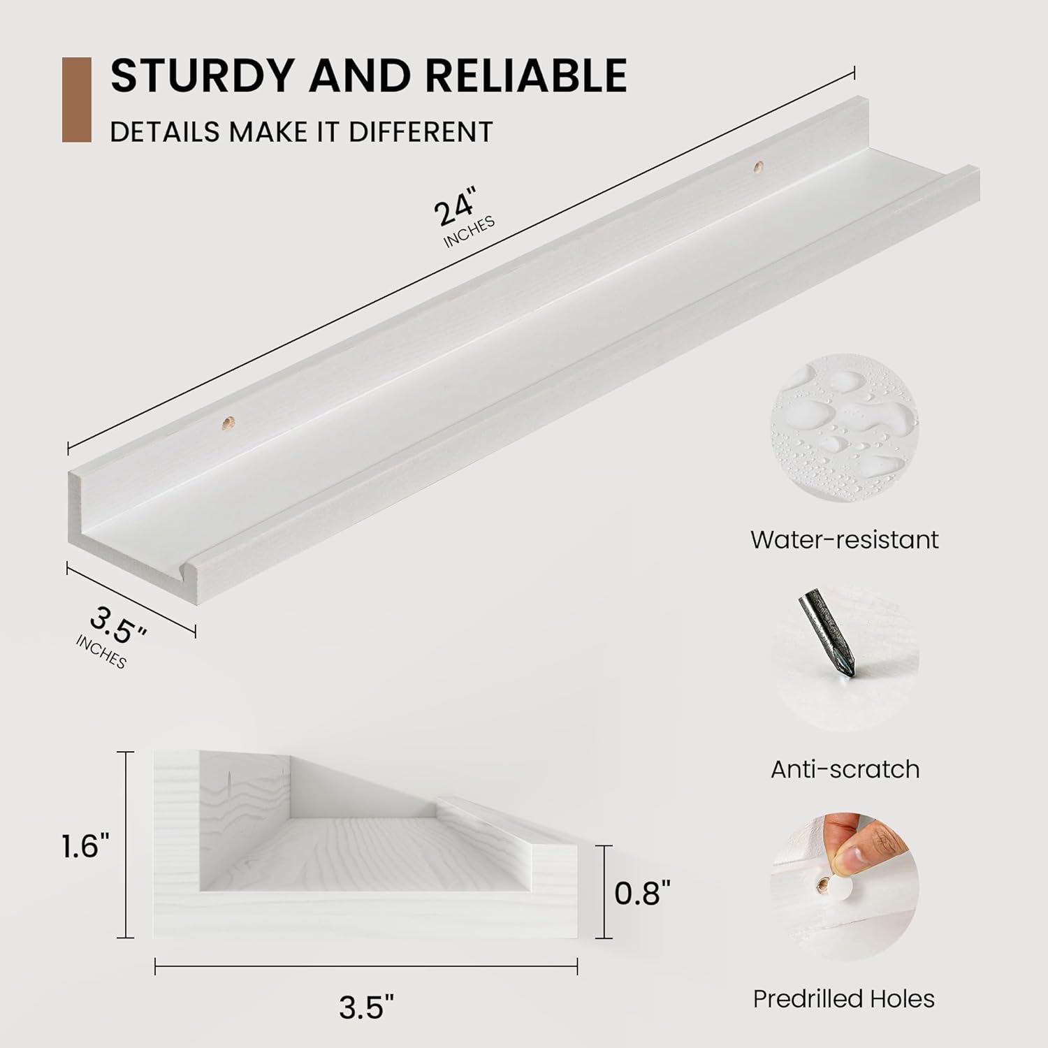 Picture Ledge Shelf, Solid Pine Wood Floating Shelves Set of 2, 24 Inches Nursery Book Shelves for Toys Storage, Kids Bookshelf Wall Mounted for Living Room Bedroom Decor Books Photo Frames, White