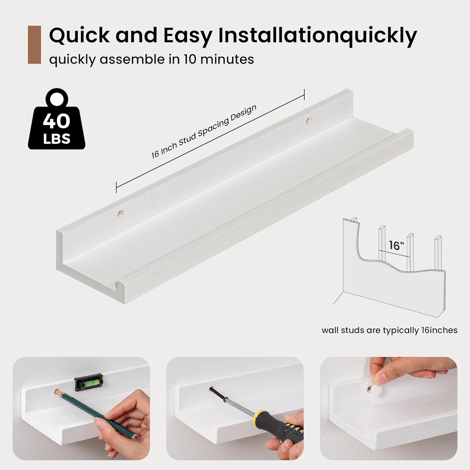 - 3.5" Floating Picture Ledge: Anti-Slip Narrow Design-3.5" ultra-narrow depth holds frames/plants without sliding, even on angled walls. Stud-Mounted Stability-16" pre-drilled holes match standard studs (hardware incl.) for wobble-free install. Clutter-Free Aesthetic-Clean lines blend with farmhouse/Scandinavian decor, focusing on your treasures