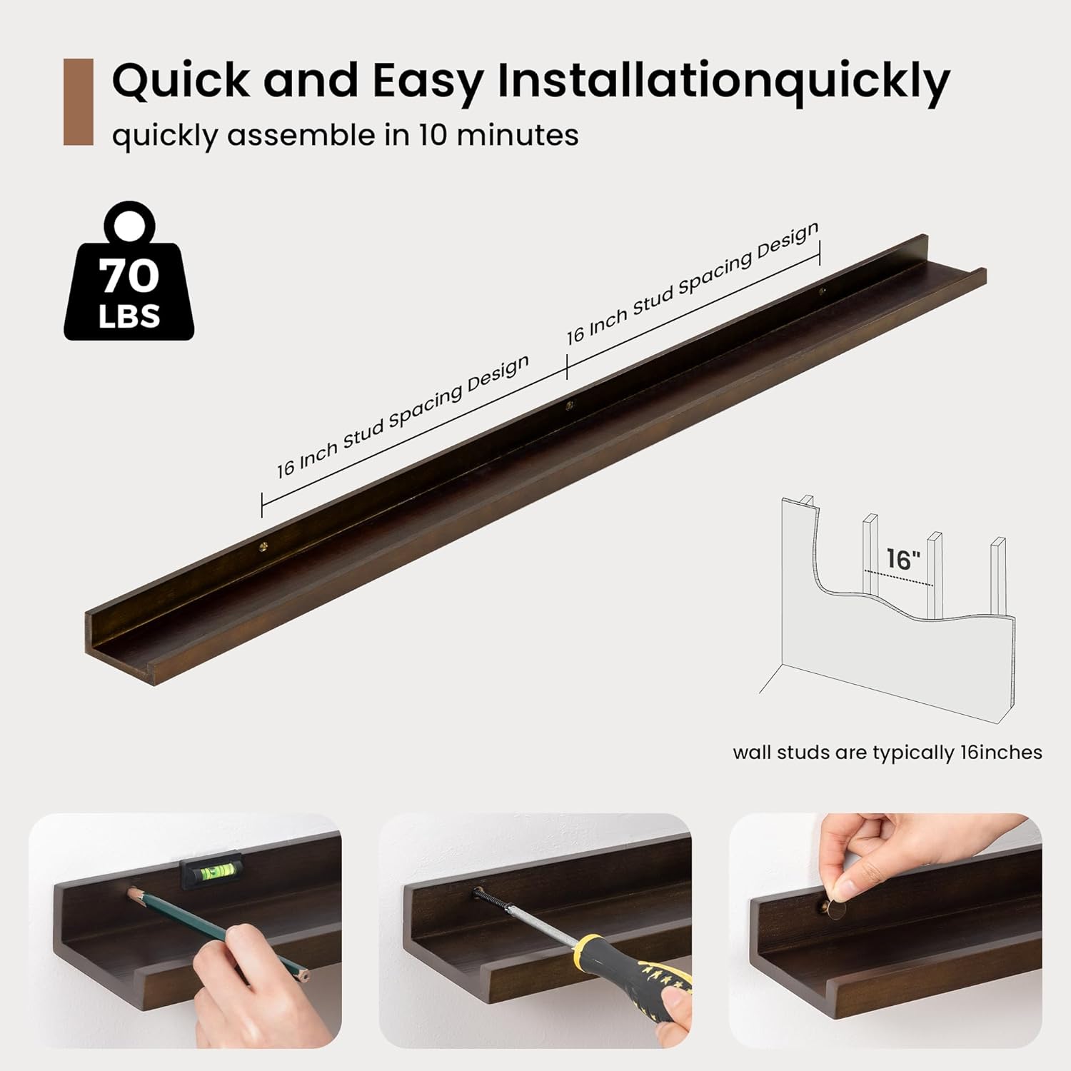 - 3.5" Floating Picture Ledge: Anti-Slip Narrow Design-3.5" ultra-narrow depth holds frames/plants without sliding, even on angled walls. Stud-Mounted Stability-16" pre-drilled holes match standard studs (hardware incl.) for wobble-free install. Clutter-Free Aesthetic-Clean lines blend with farmhouse/Scandinavian decor, focusing on your treasures