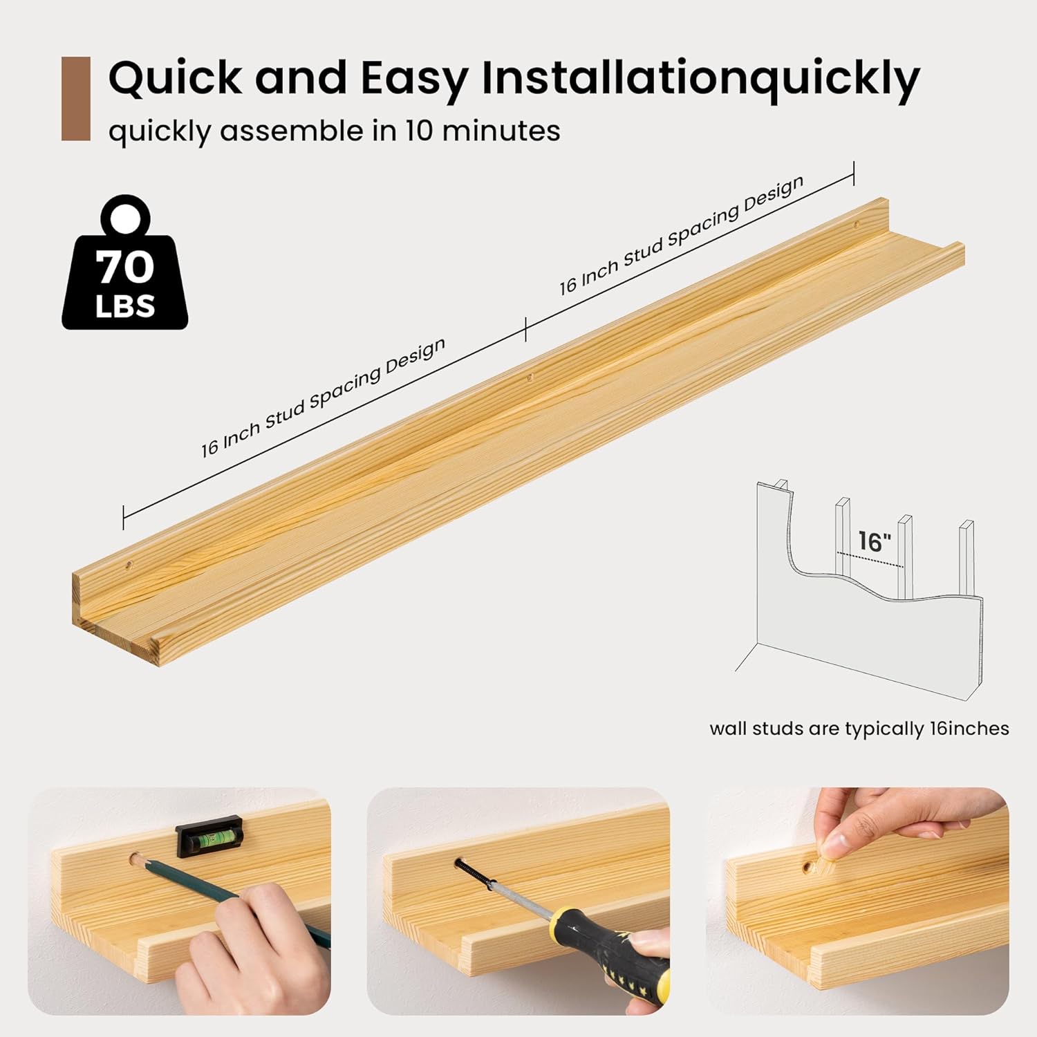 - Unique Solid Pine Wood Shelves: Each picture ledge is meticulously handcrafted from premium solid pine wood, showcasing one-of-a-kind grain patterns, organic color variations, and a hand-finished texture. No two shelves are identical—transform your space with a bespoke touch that reflects your individuality