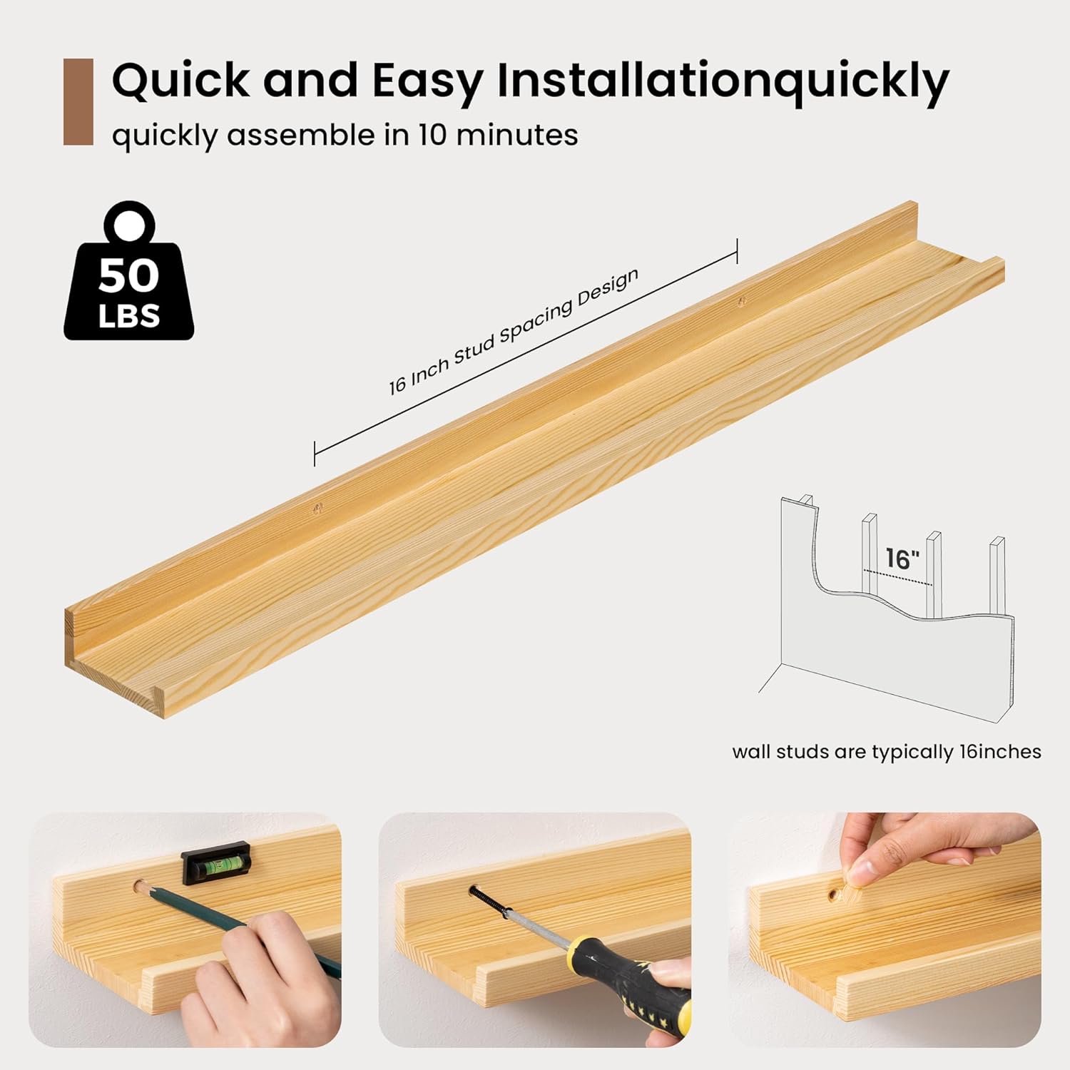- Unique Solid Pine Wood Shelves: Each picture ledge is meticulously handcrafted from premium solid pine wood, showcasing one-of-a-kind grain patterns, organic color variations, and a hand-finished texture. No two shelves are identical—transform your space with a bespoke touch that reflects your individuality