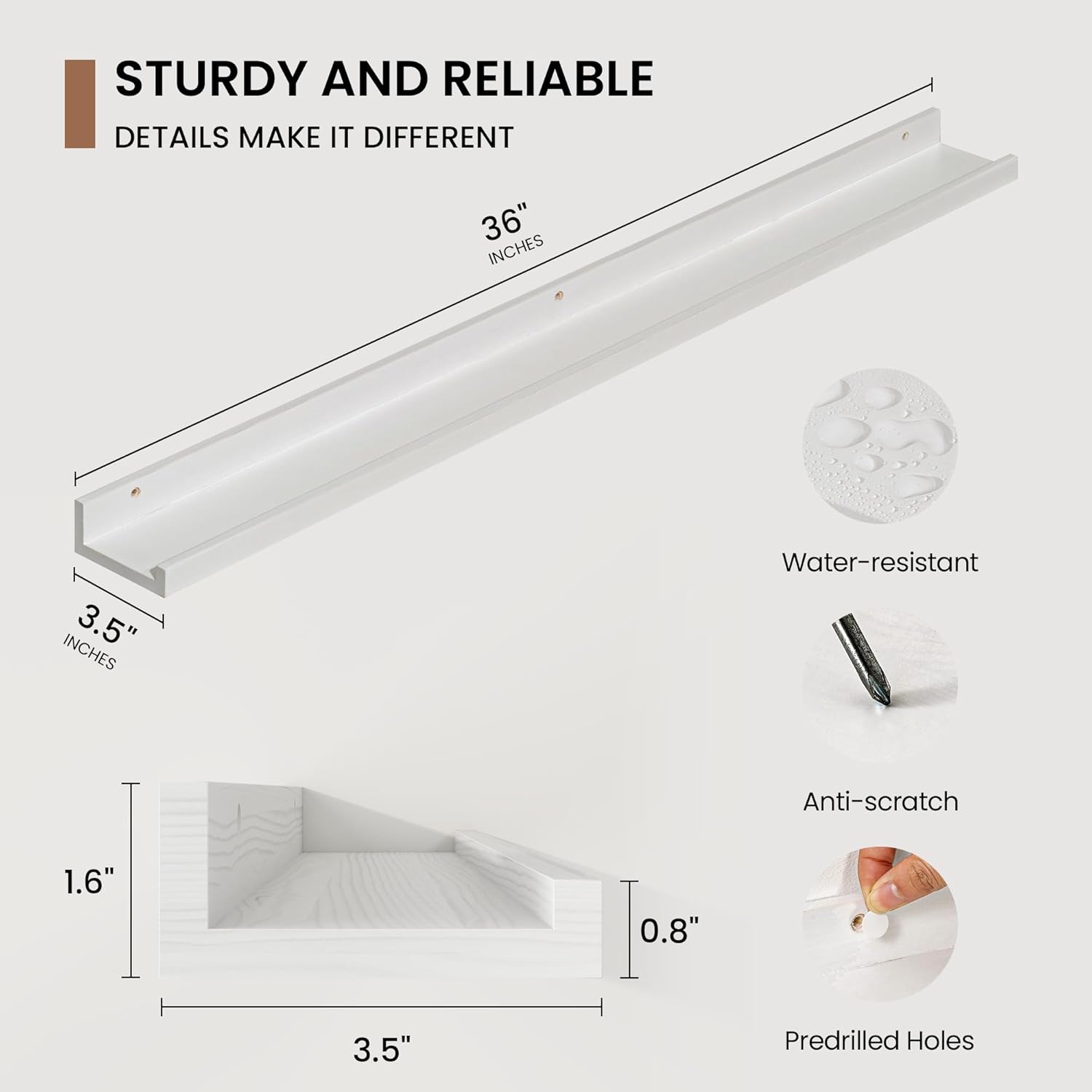 Picture Ledge Shelf, Solid Pine Wood Floating Shelves Set of 2, 36 Inches Nursery Book Shelves for Toys Storage, Kids Bookshelf Wall Mounted for Living Room Bedroom Decor Books Photo Frames, White