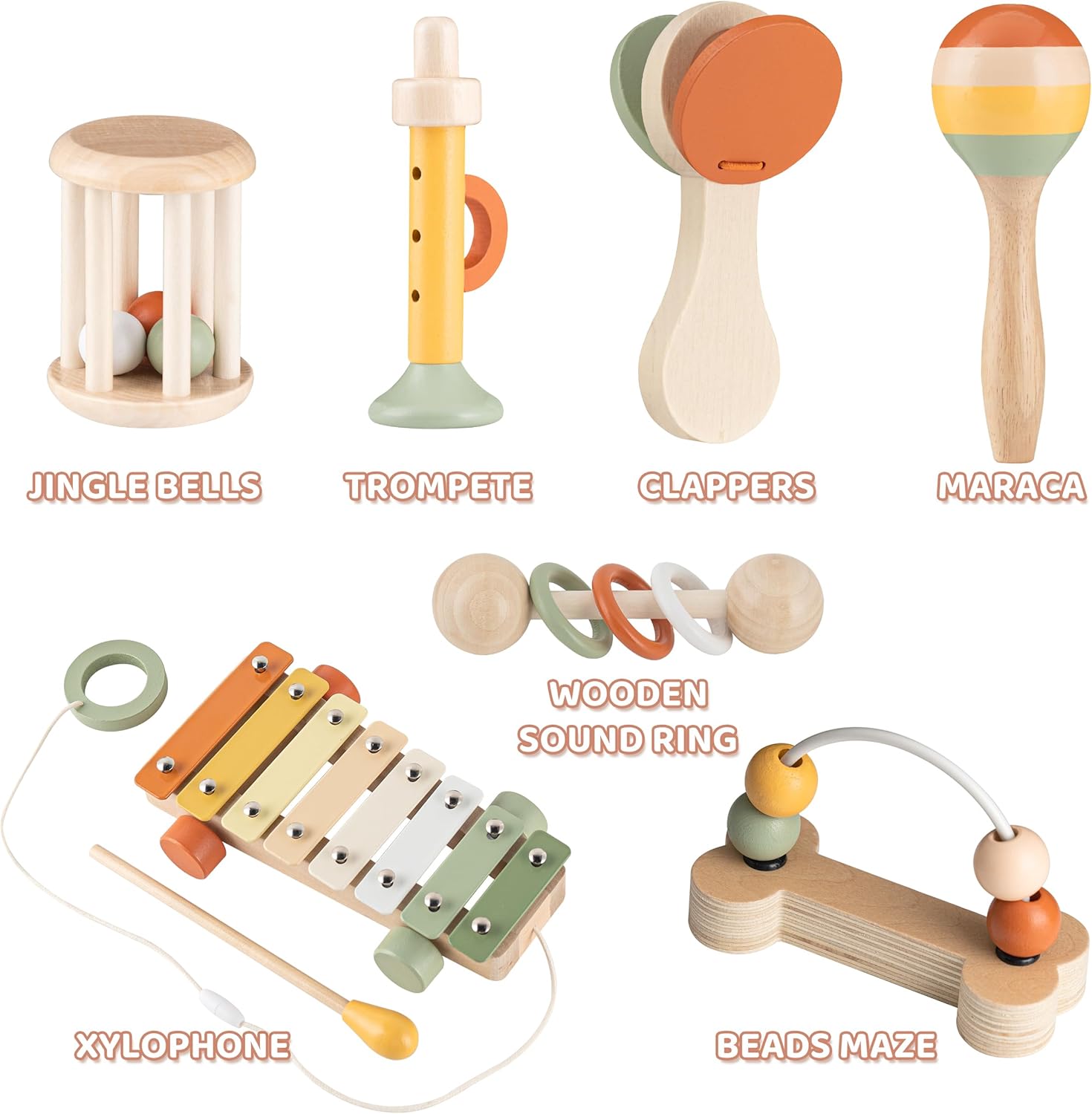 - ๐ Safe and Durable - The wooden musical toys are made from natural wood with organic pigments and non-toxic water-based paints. All items rigorously adhere to stringent CPC/ASTM standards. Smooth, rounded edges, no sharp edges, no harm to hands. The sturdy construction can withstand enthusiastic play while ensuring your baby's safety and comfort.