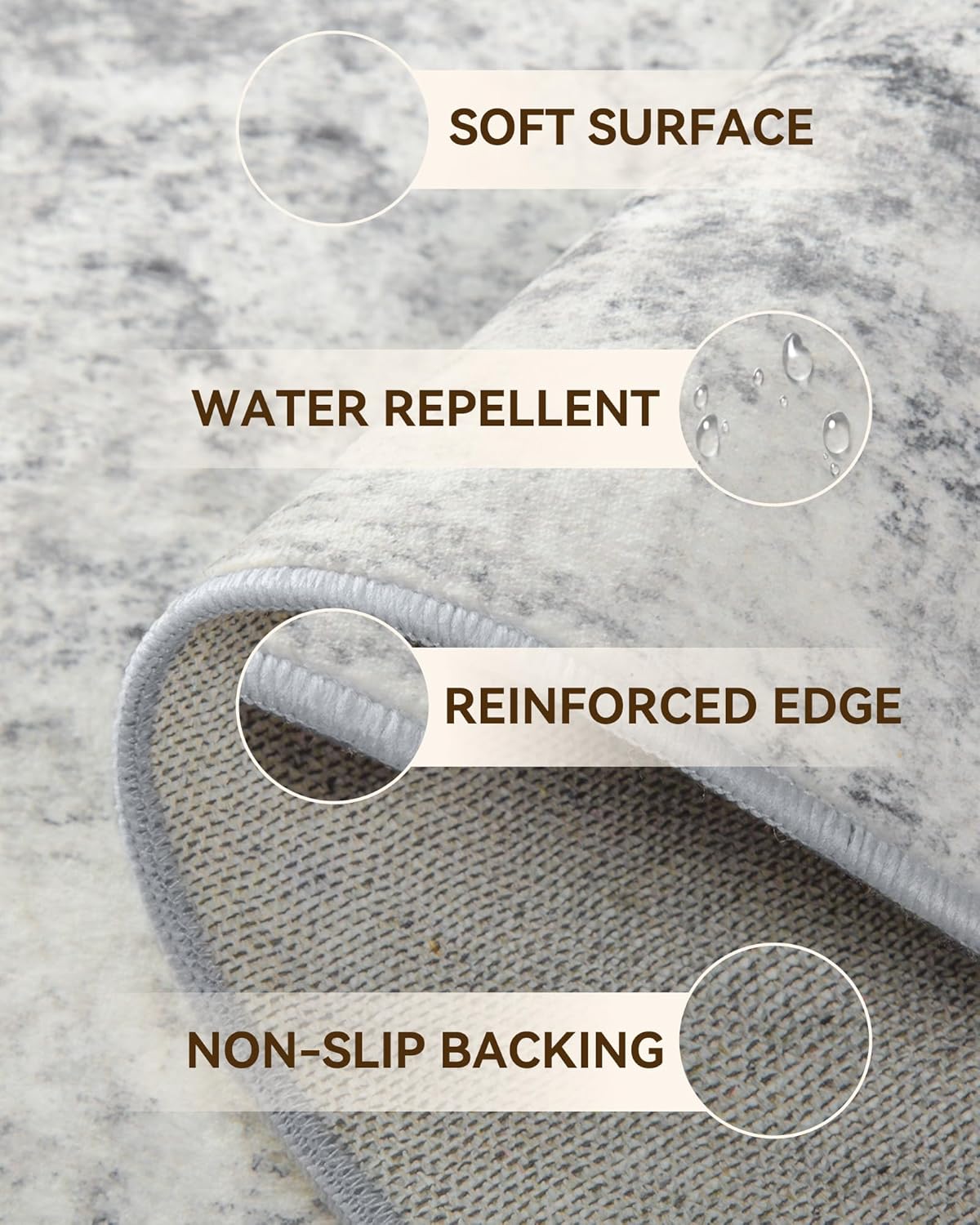 - Tides Series – Effortless style that flows with your life.This modern machine-washable non-slip rug features reinforced edges and a low-pile design that resists dirt. Its water-repellent surface makes spills easy to clean - liquids bead up for quick wiping. Simply machine wash in cold water (no bleach) to refresh. The non-slip backing keeps it securely in place. A perfect blend of function and contemporary design for active homes.