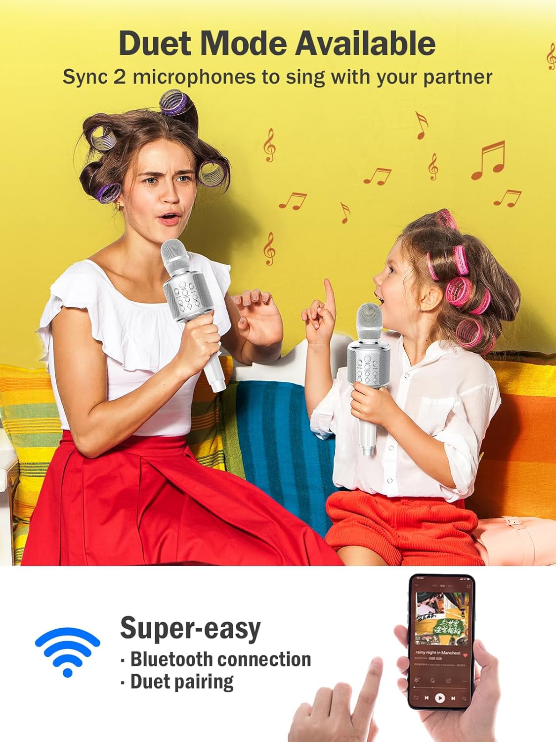 - 【Duet Mode for Singing Together】The karaoke microphone can synchronize with another one, enabling two people singing together. You can sing alone, or sing with your kids and friends, enjoying the happiness together.