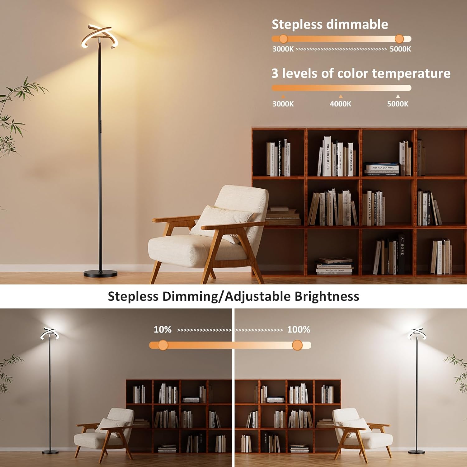 - 【Adjustable Brightness & Color Temperature】- Torchiere floor lamps for bedroom come with stepless dimming from 10% to 100%, ensuring that you can easily set up a perfectly bright environment for any occasion. Easily switch and adjust between warm white (3000K) to cool daylight (6000K) to transition from a cozy to an energizing atmosphere. With four preset modes (Working, Reading, Relaxing, Night), simply tap a button of remote to light up your room and illuminate your life.