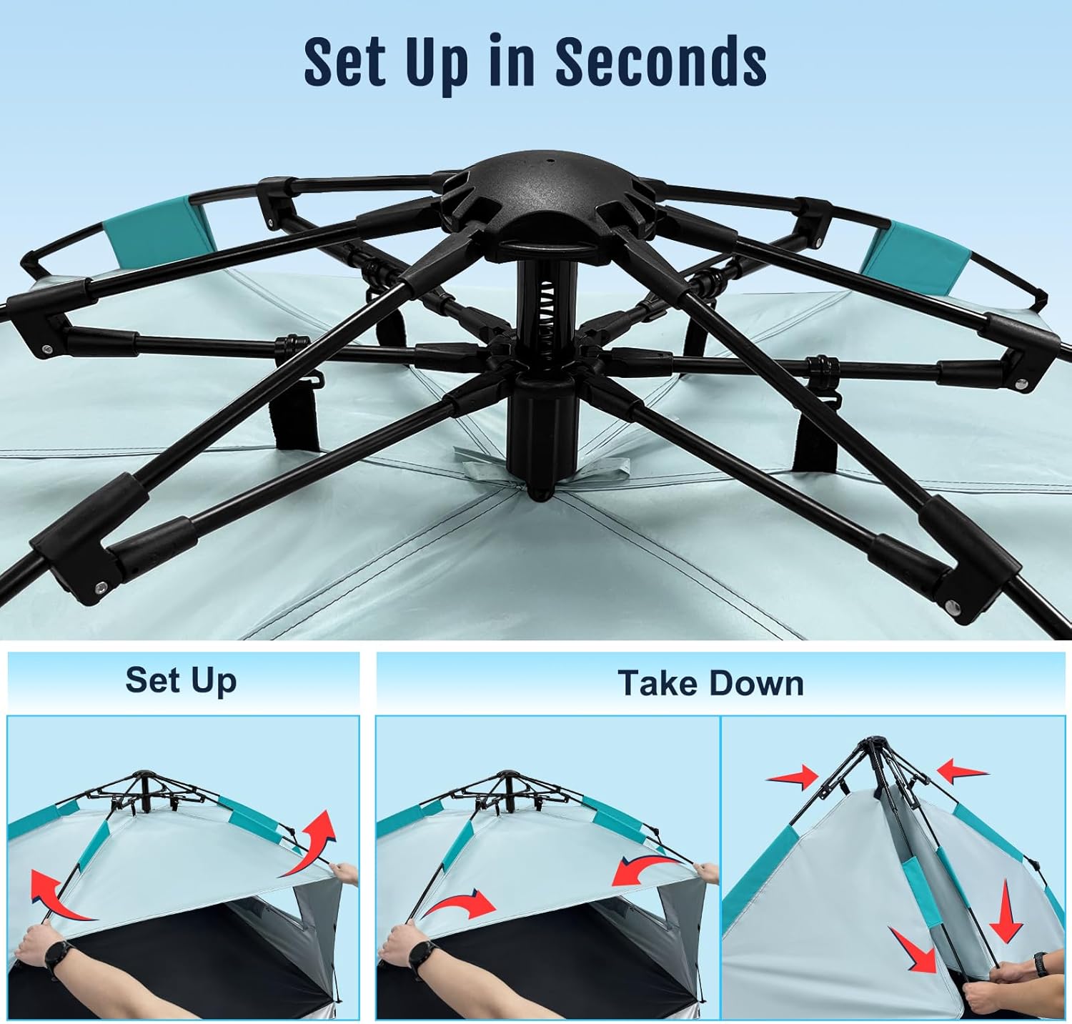 - Outdoor Protection & Great Ventilation - Premium 210t sun-proof material plus a special embedded silver-coated material to provide great UV protection from the sun and 3 added roll up openings maintain airflow to keep the tent cool when staying inside.