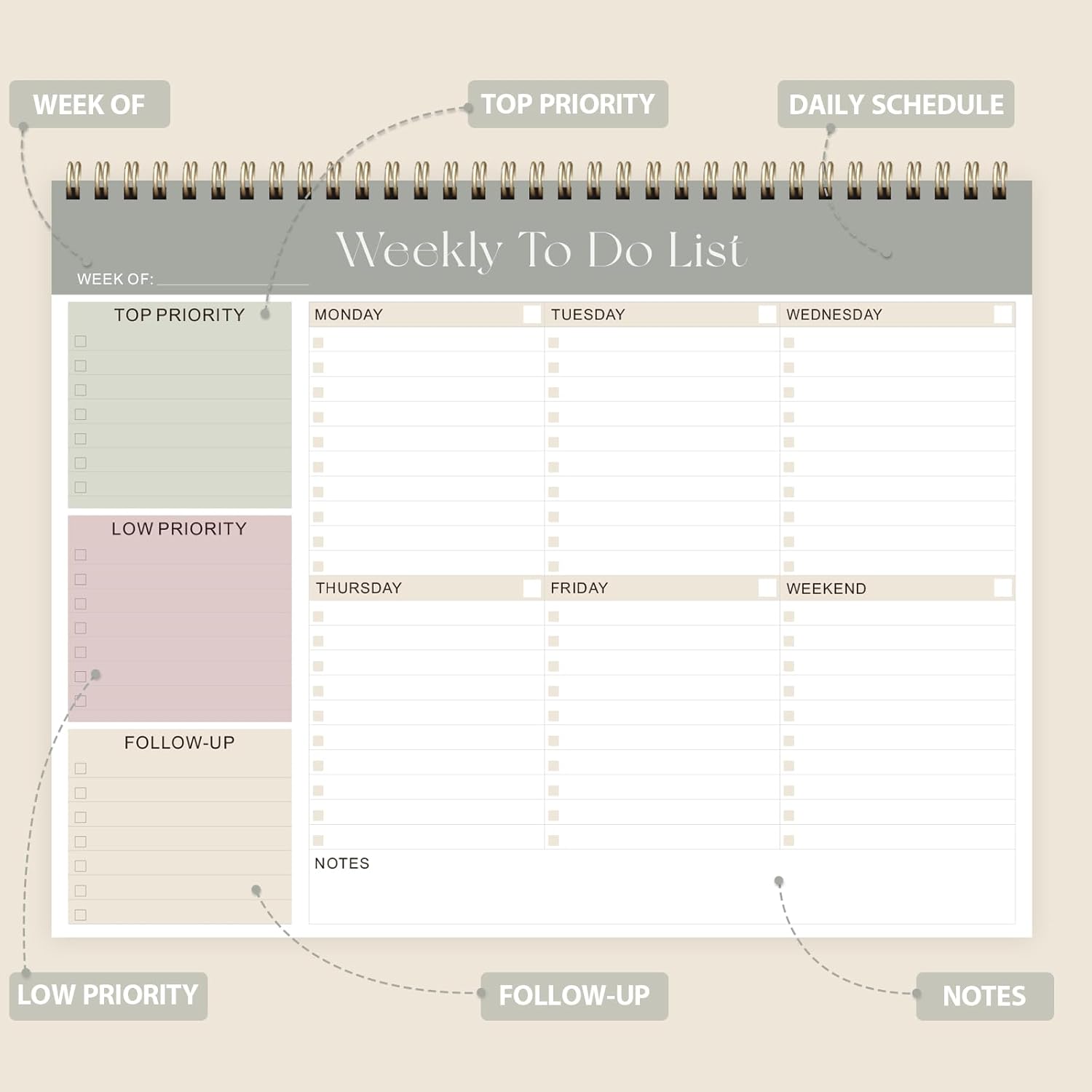 - THOUGHTFUL FEATURES FOR PLANNING - Our weekly to do list notepad is designed with a top priority, a low priority, and a follow-up section, allowing you to prioritize and stay organized. It also has to do list part, notes part, which can help you track important daily events and develop daily habits.