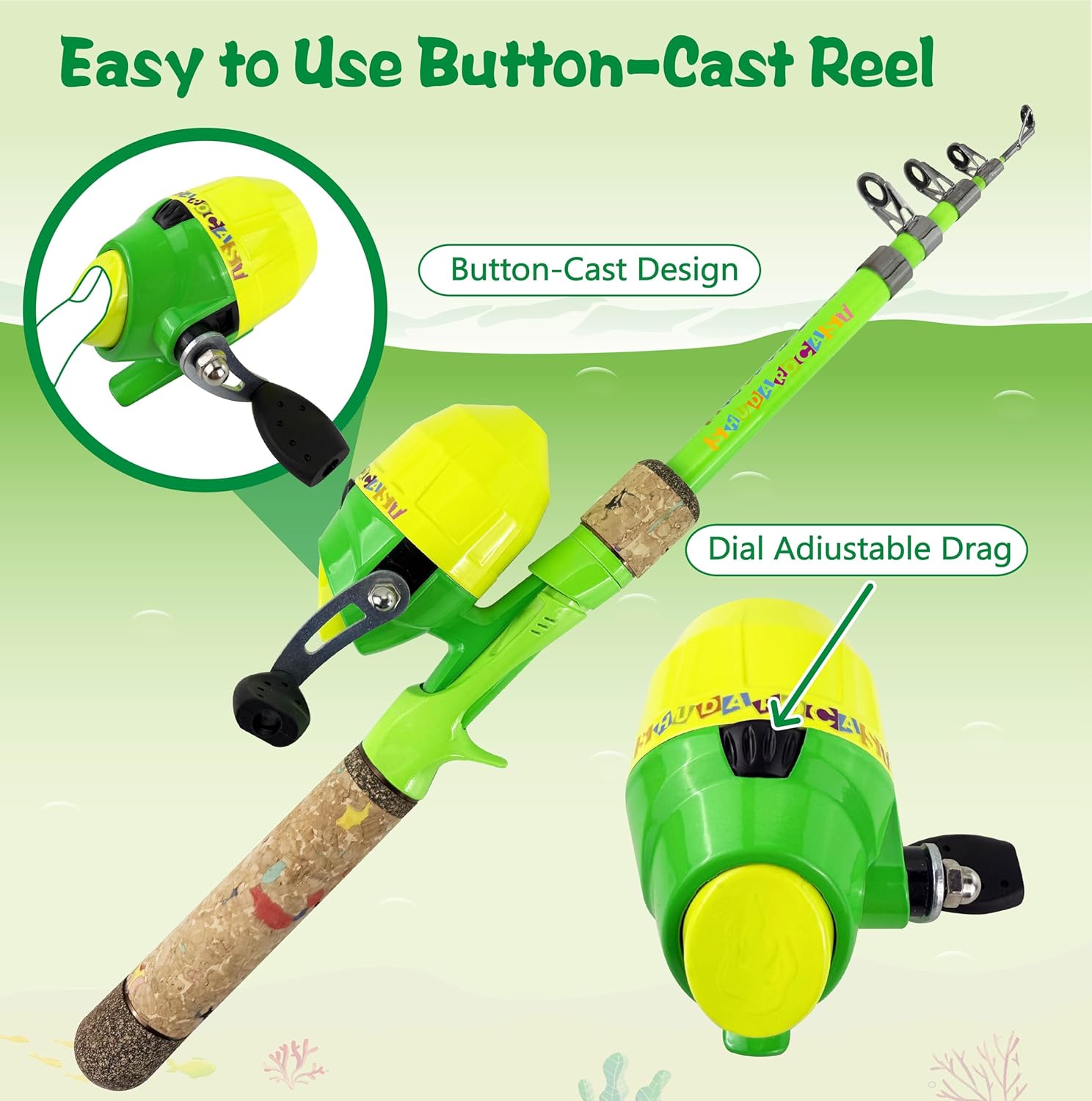 - 🐟【Kids Fishing Pole Set】It's an all-in-one Kids Fishing Rod and Reel Combo with tackle box including a selection of fishing lures fishing hooks fishing swivels Bait net fishing bobbers fishing weights suited to different fishing situations. A travel carry bag is also offered. Perfect kids fishing poles.