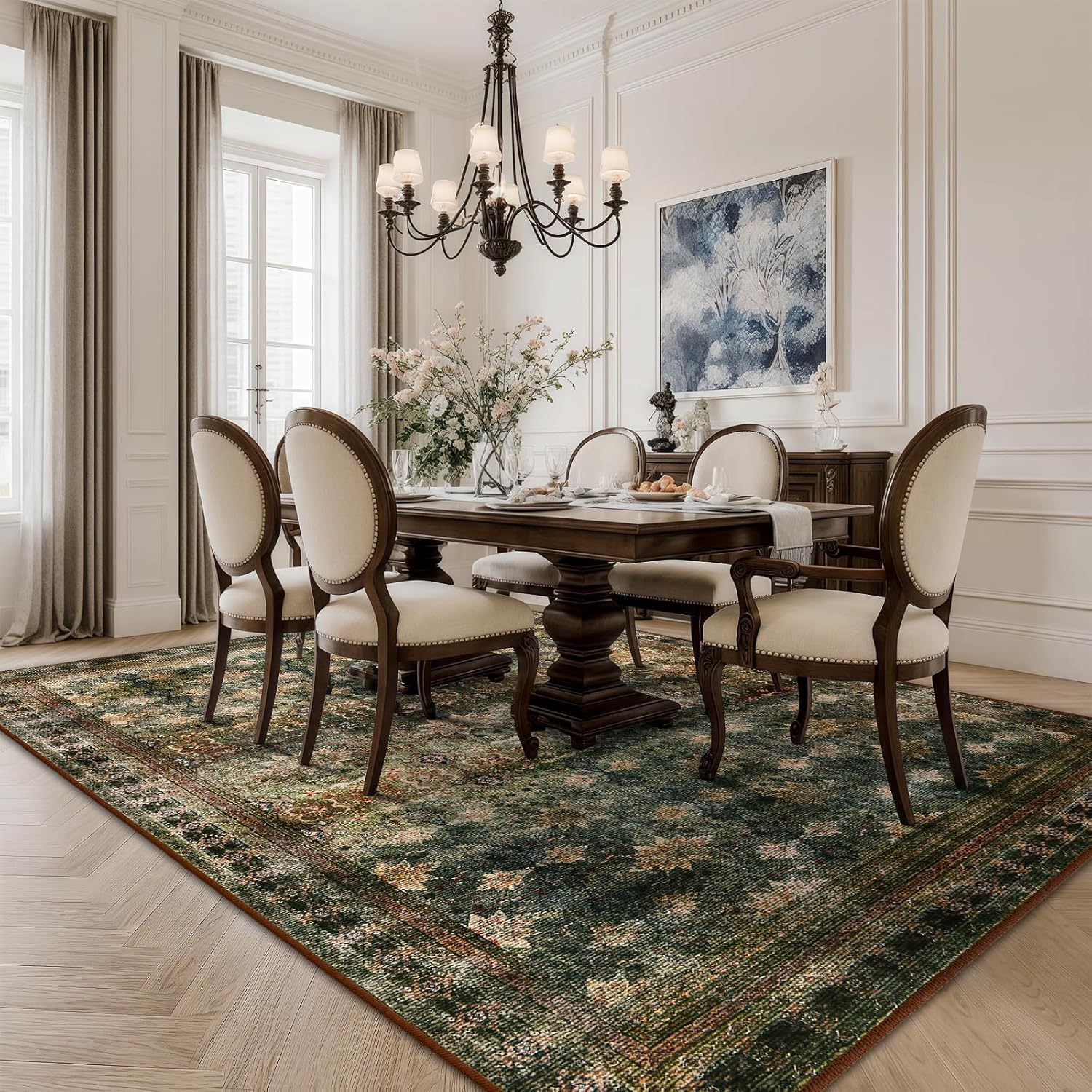 Large 8x10 Washable Area Rug for Living Room, No Shedding Vintage Floral Print Rugs Non Slip, Indoor Thin Retro Accent Carpet for Bedroom Farmhouse Dining Room(Dark Green/Brown/Multi)