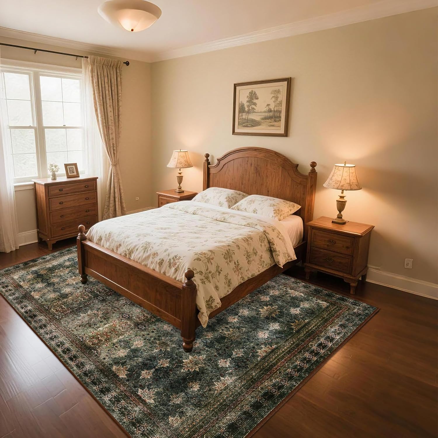 5x7 Washable Area Rug for Living Room Rustic, Non Slip Vintage Floral Bedroom Rugs Retro, Traditional Indoor Floor Carpet for Dining Room, Farmhouse, Office Classroom(Dark Green/Brown/Multi)