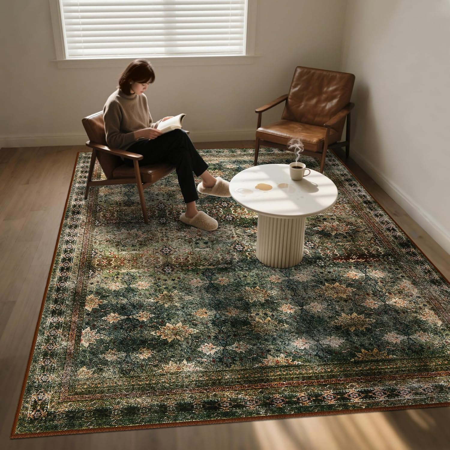 6x9 Washable Area Rug Non Slip, Thin Vintage Floral Living Room Rug Low Pile, Indoor Large Distressed Print Carpet for Bedroom, Dining Room, Farmhouse, Home Office, Dorm(Dark Green/Brown/Multi)