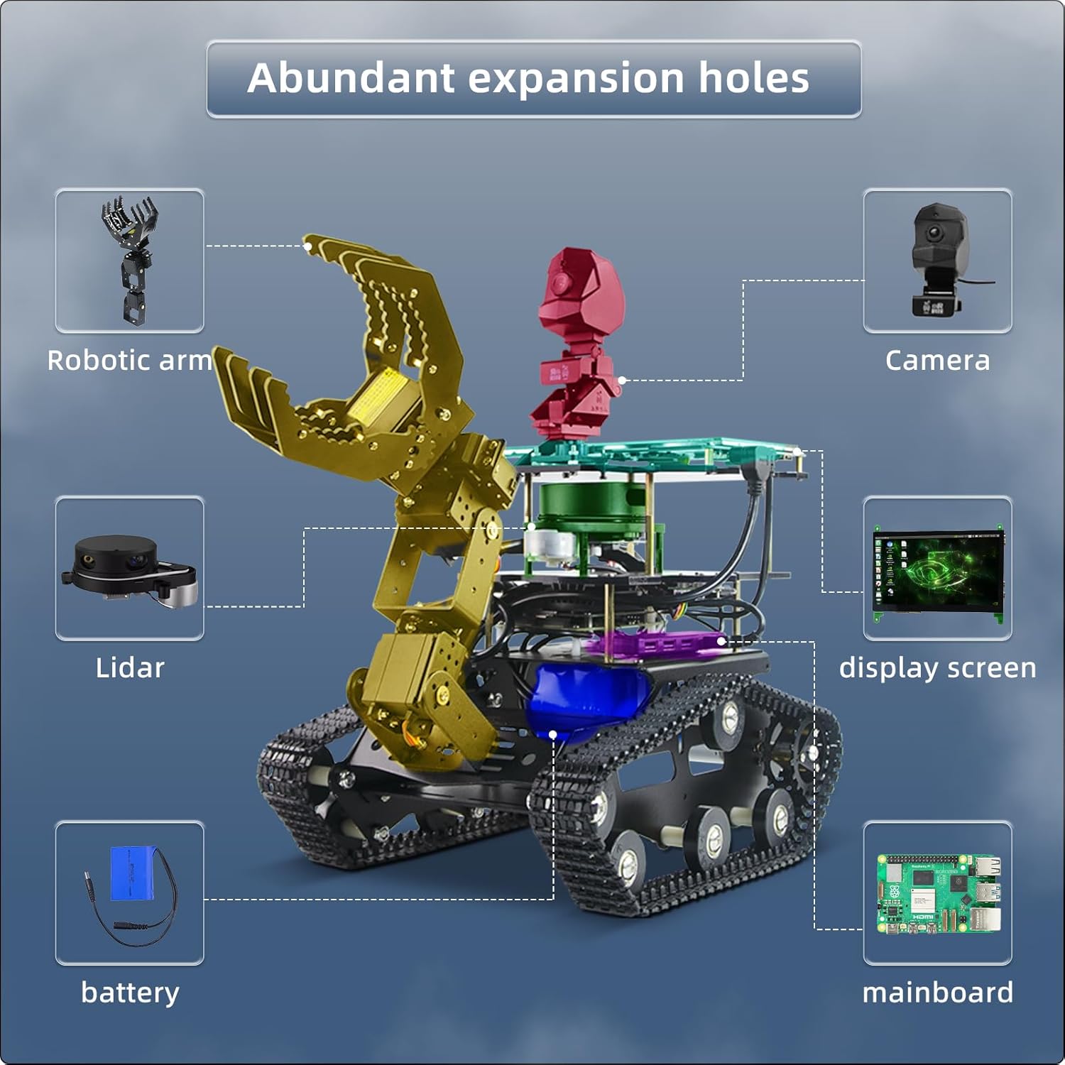 - 【More extended functions】The tank robot chassis contains multiple expansion ports and is fully compatible with popular controllers on the market such as Raspberry Pi, Jetson Nano, Arduino ect. You also can add multiple sensors and servos to create your robot.