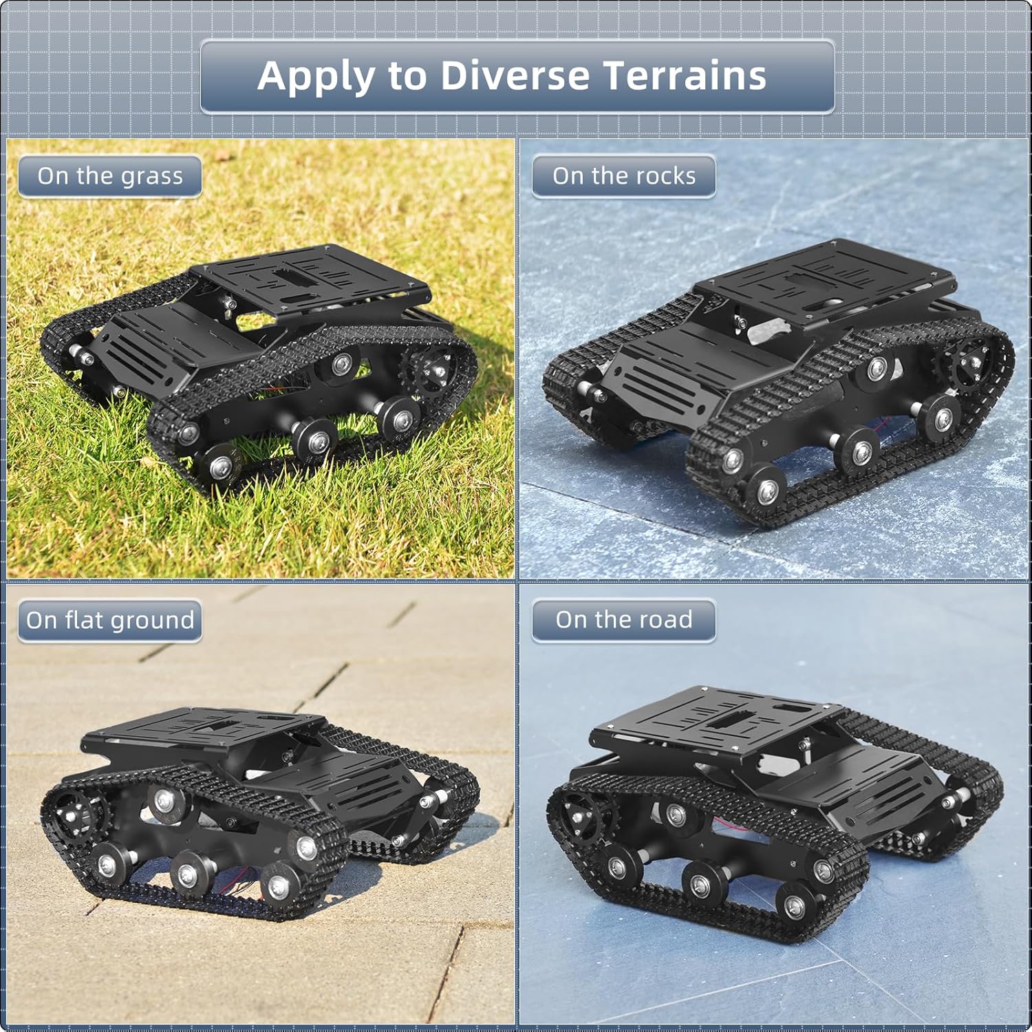 - 【Nice damping effect】The track is made of engineering plastic that basically assured the good elasticity, excellent damping effect and large road grip of the product. What’ s more, The high speed motors and premium tracks also allows it to move swiftly everywhere. And the chassis to carry a weight of 5KG.