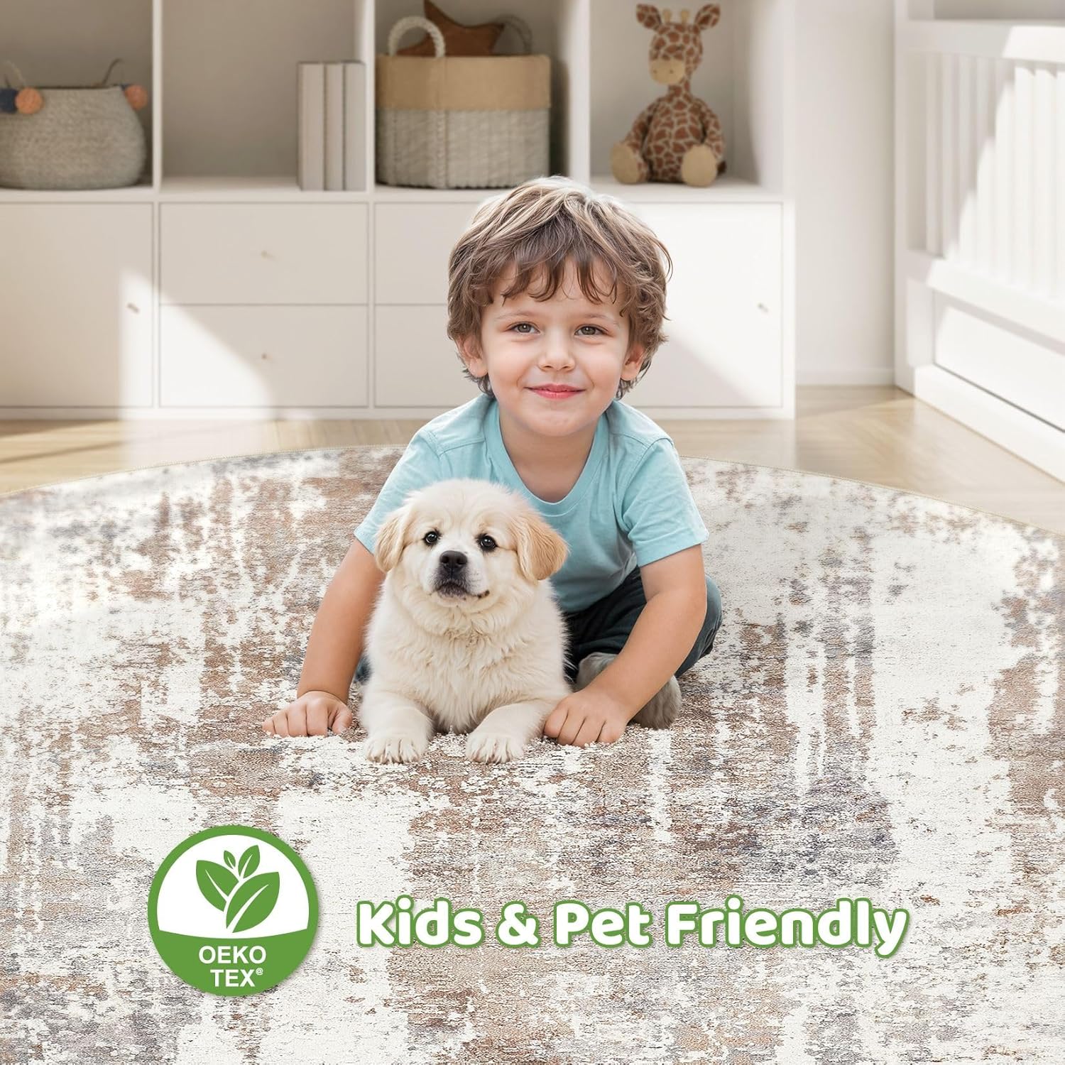 Round Rug Living Room Rugs: 8Ft Washable Circle Large Abstract Modern Soft Stain Resistant Non Slip Indoor Floor Carpet for Bedroom Nursery Office Dining Room Dorm Home House Decor- Brown