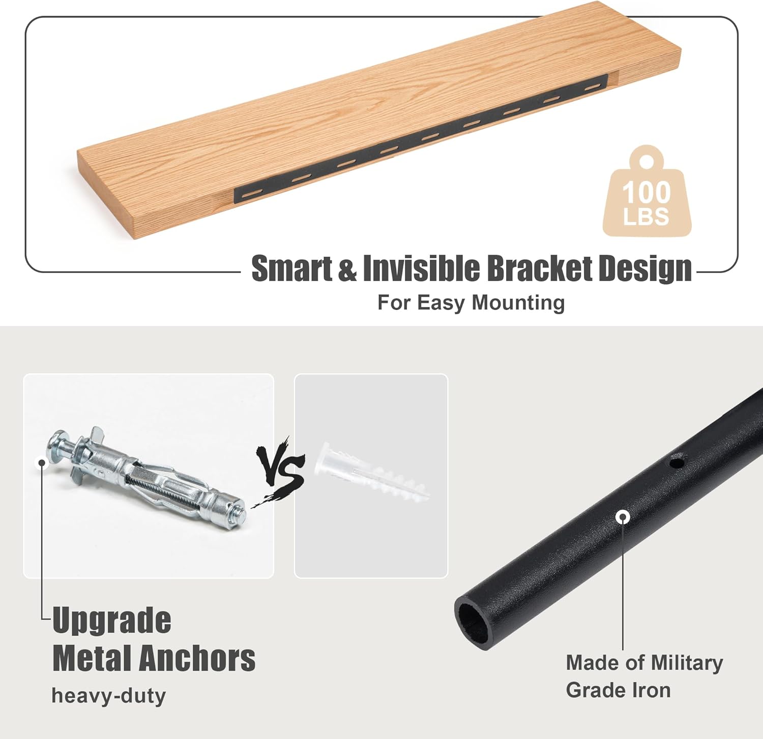 - Sturdy & Functional: Equipped with heavy-duty metal brackets, each shelf supports up to 100 lbs. The flat surface and stable construction make them suitable for any room while showcasing the natural beauty of the wood grain.