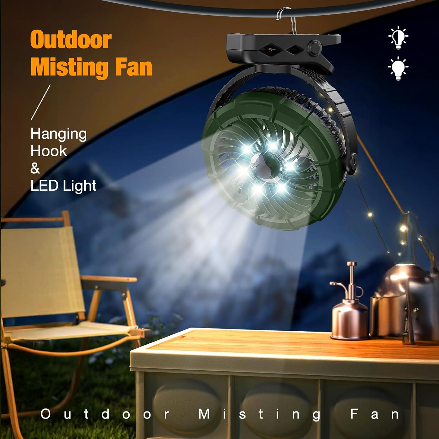 - 💦【LED Light & 360° Rotation】The cooling fan supports 360° horizontal and vertical rotation, allowing you to get airflow from different directions. Also, portable misting fan have 2 kinds of brightness settings, provides the ideal light source for outdoor activities at night, such as camping, picnics, fishing.