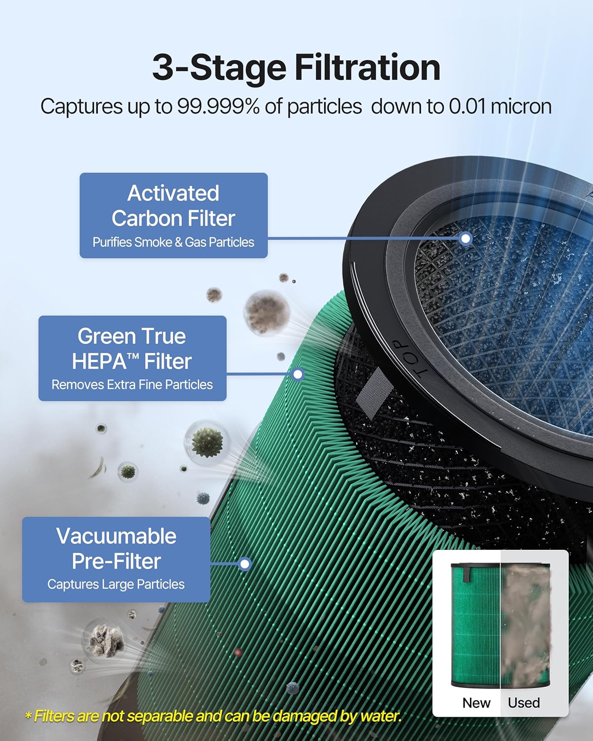 - Advanced 3-in-1 Filteration system combines a vacuumable pre-filter, activated carbon, and a True HEPA Filter effectively reduces up to 99.999% of particles down to 0.01 microns in the air, including pollen, pollutants and other allergens. It also reduces more than 99% of volatile organic compounds and reduces fumes such as NH3 and CH3CHO.
