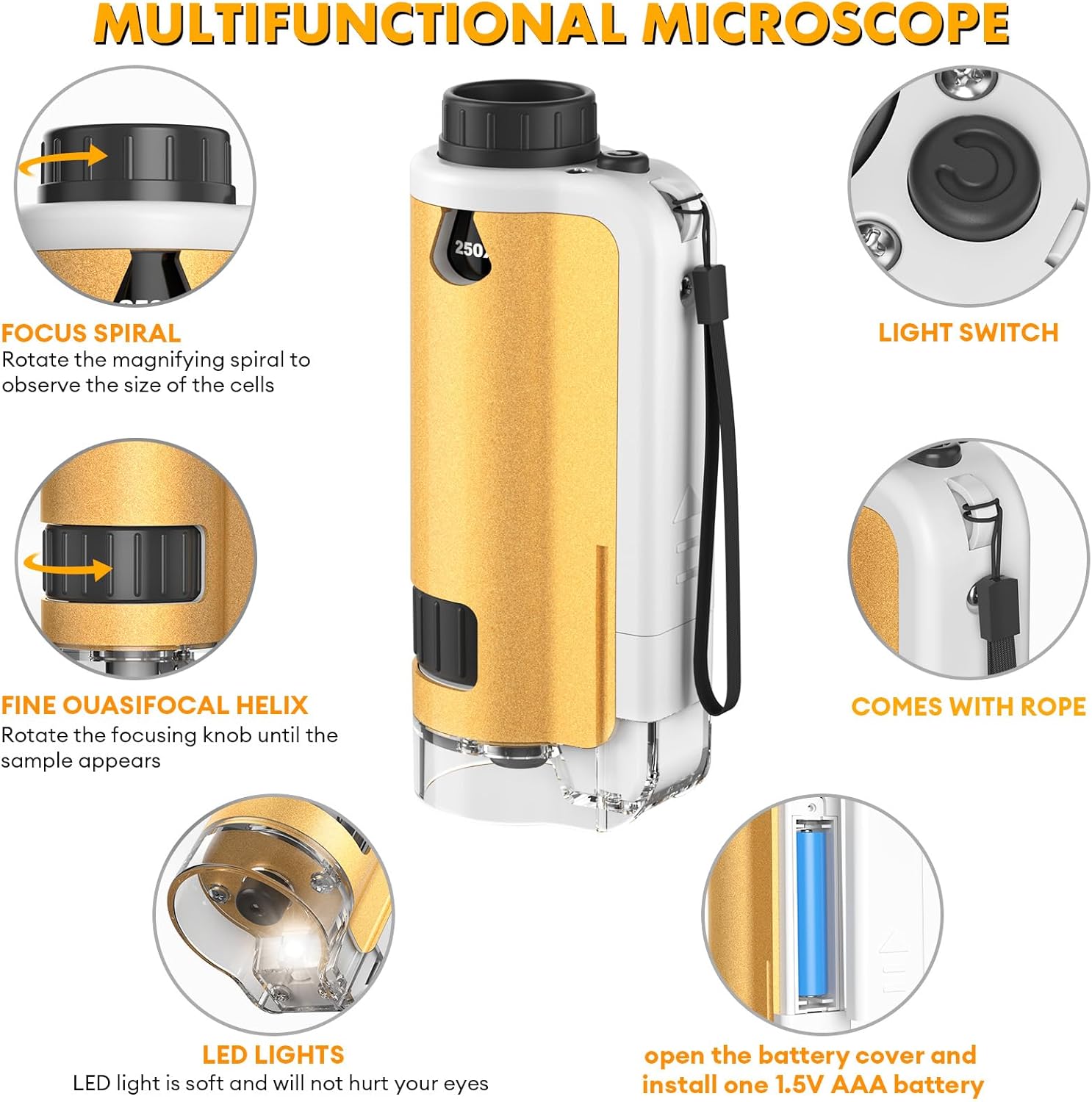- Versatile Magnification & Clear Viewing: With dual-focus capabilities and adjustable magnification from 100X to 250X, children can easily zoom in on objects with impressive clarity. The built-in LED light guarantees bright, clear images even in low-light conditions.
