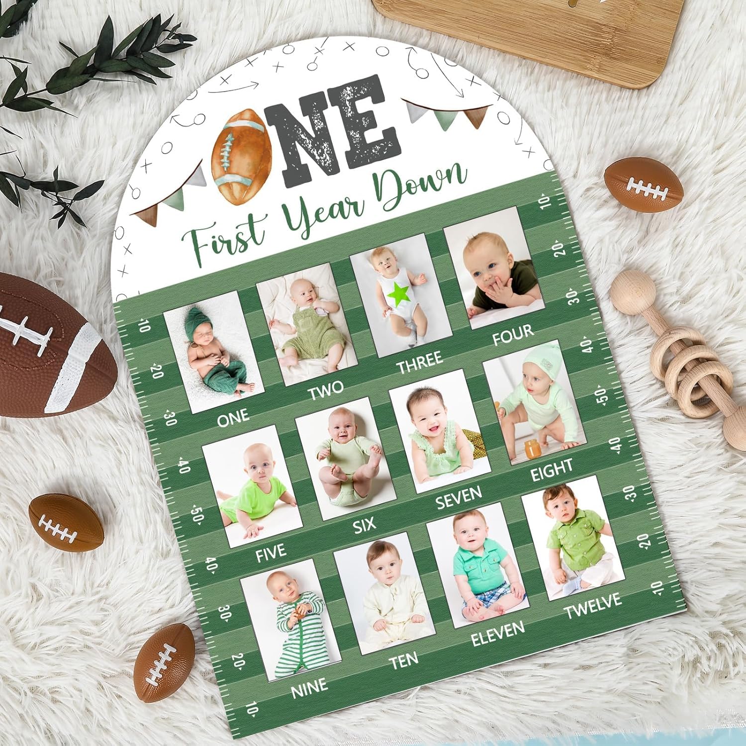 - Package Includes: This set includes 1pcs of one first year down photo board, measuring 16.9 x 12 x 0.2 inches, suitable for 2 x 2.8 inches photos. Designed to be a keepsake, this football 1st birthday wooden board holds 12 monthly photos, celebrating your baby's growth and special milestones throughout their first year.