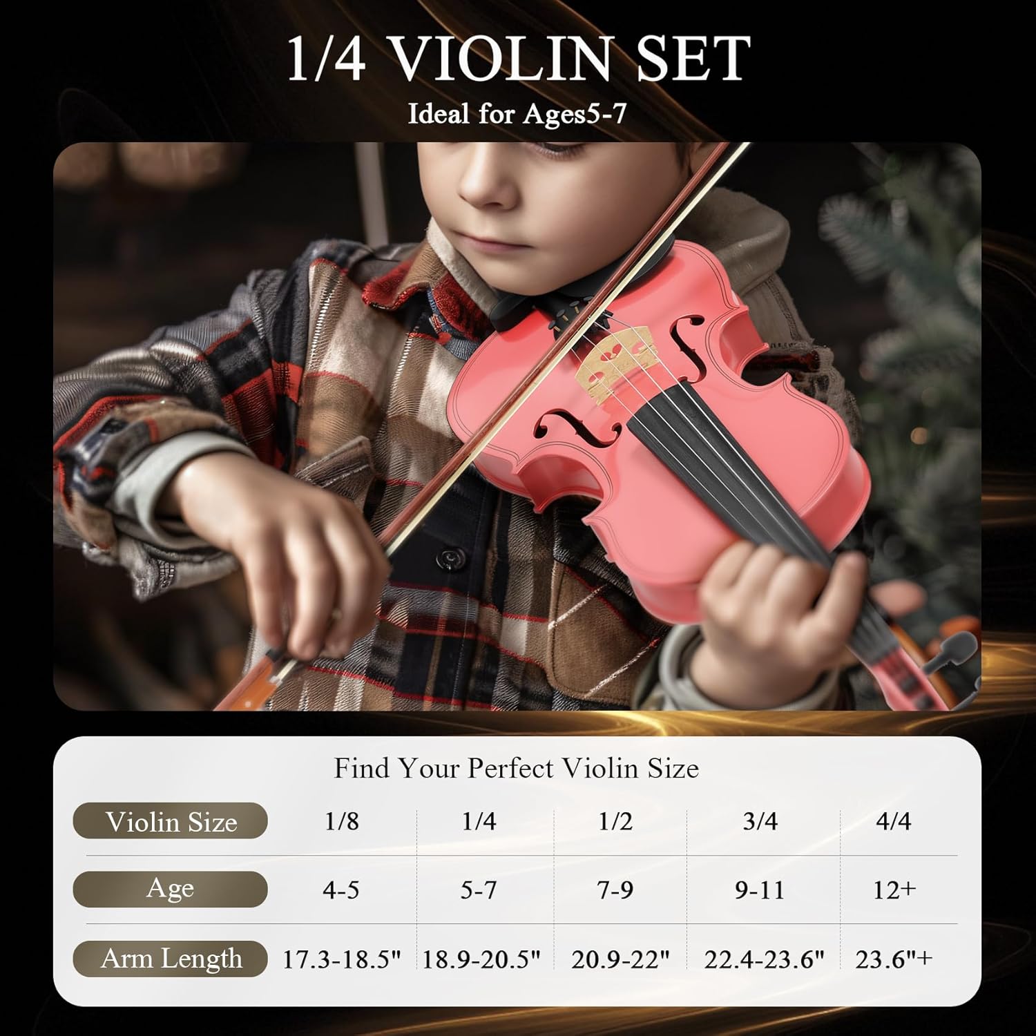 1/4 Violin Kit, Beginner Violin for Kids, Students, Complete Kids Violins Set with Case, Bow, Rosin, Ideal for Kids Violins Beginner Ages 5-7, Pink