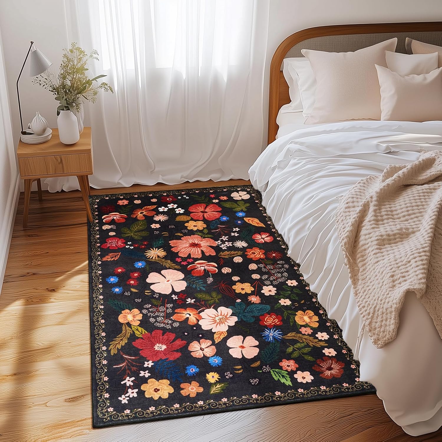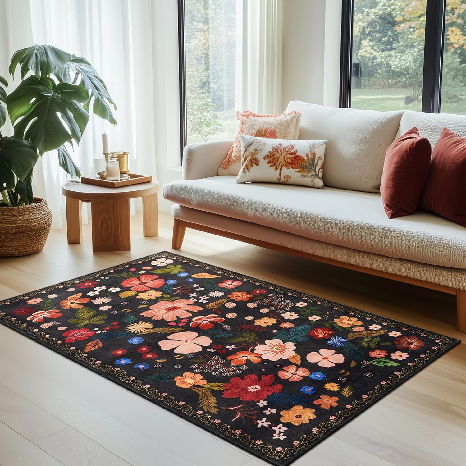 Area Rugs 3x5 for Living Room Machine Washable Soft Faux Fur Black Small Carpet Rug Low Pile Non Slip Stain Resistant Vintage Boho Floral Rugs for Bedside Indoor Entrance Nursery Study Room