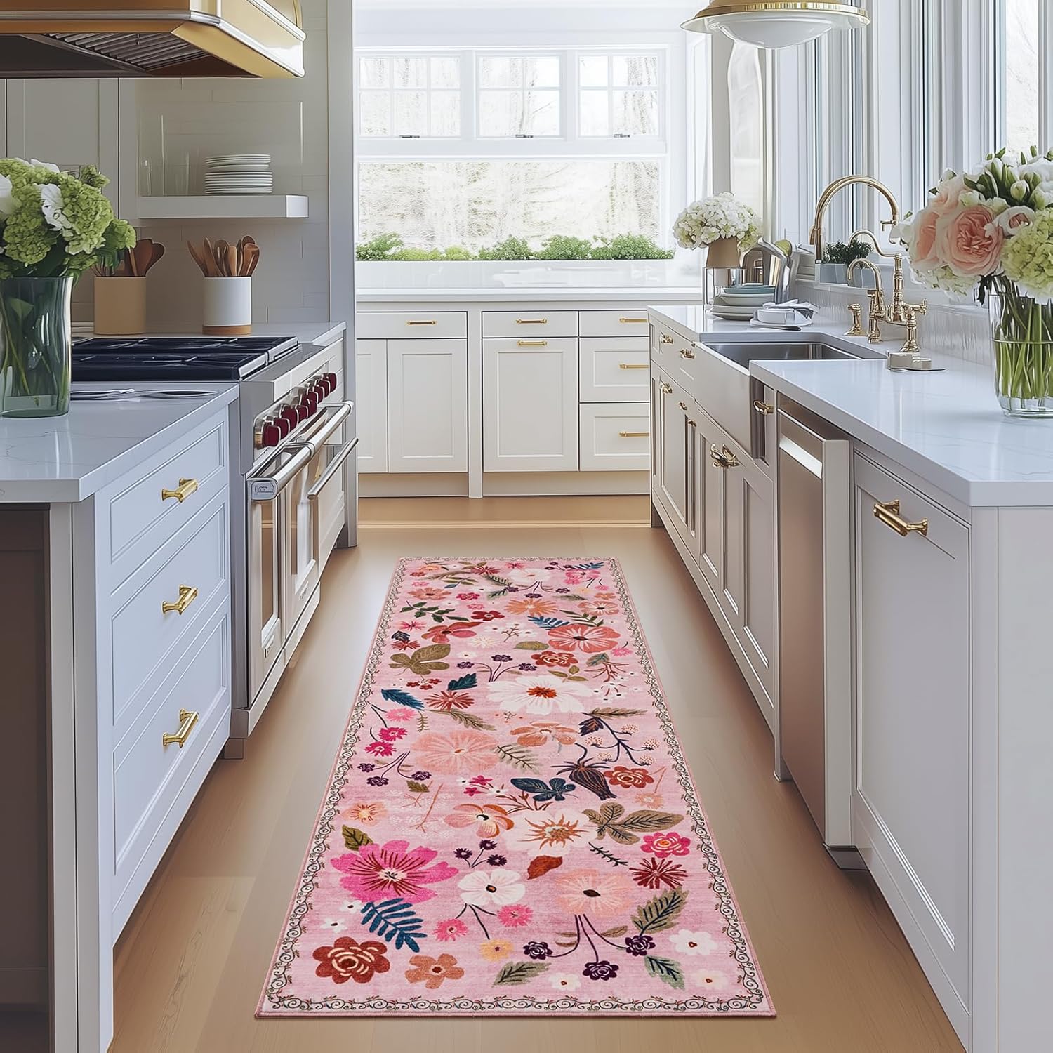 Pink Runner Rug 2x6 for Kitchen Machine Washable Non Slip with Rubber Backing Boho Vintage Floral Carpet Soft Stain Resistant Thin Long Rugs for Entrance Hallways Laundry Bedside Bathroom Girly Decor