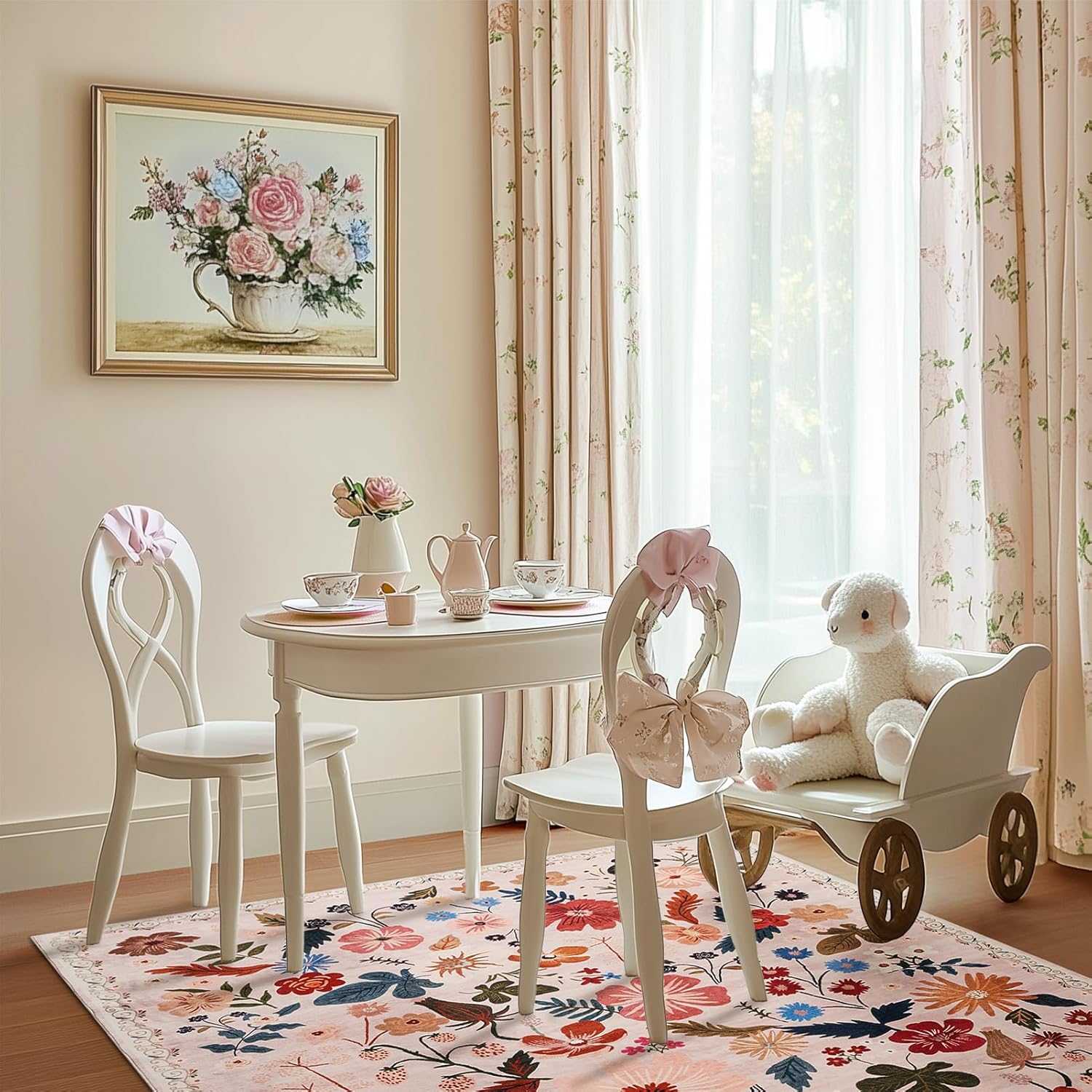Boho Floral Area Rugs 5x7 Soft Washable Stain Resistant Indoor Floor Carpet Rug Vintage Beige Low Pile Non Slip Rug Spring Farmhouse for Living Room Bedroom Dining Room Playroom Nursery Family Room