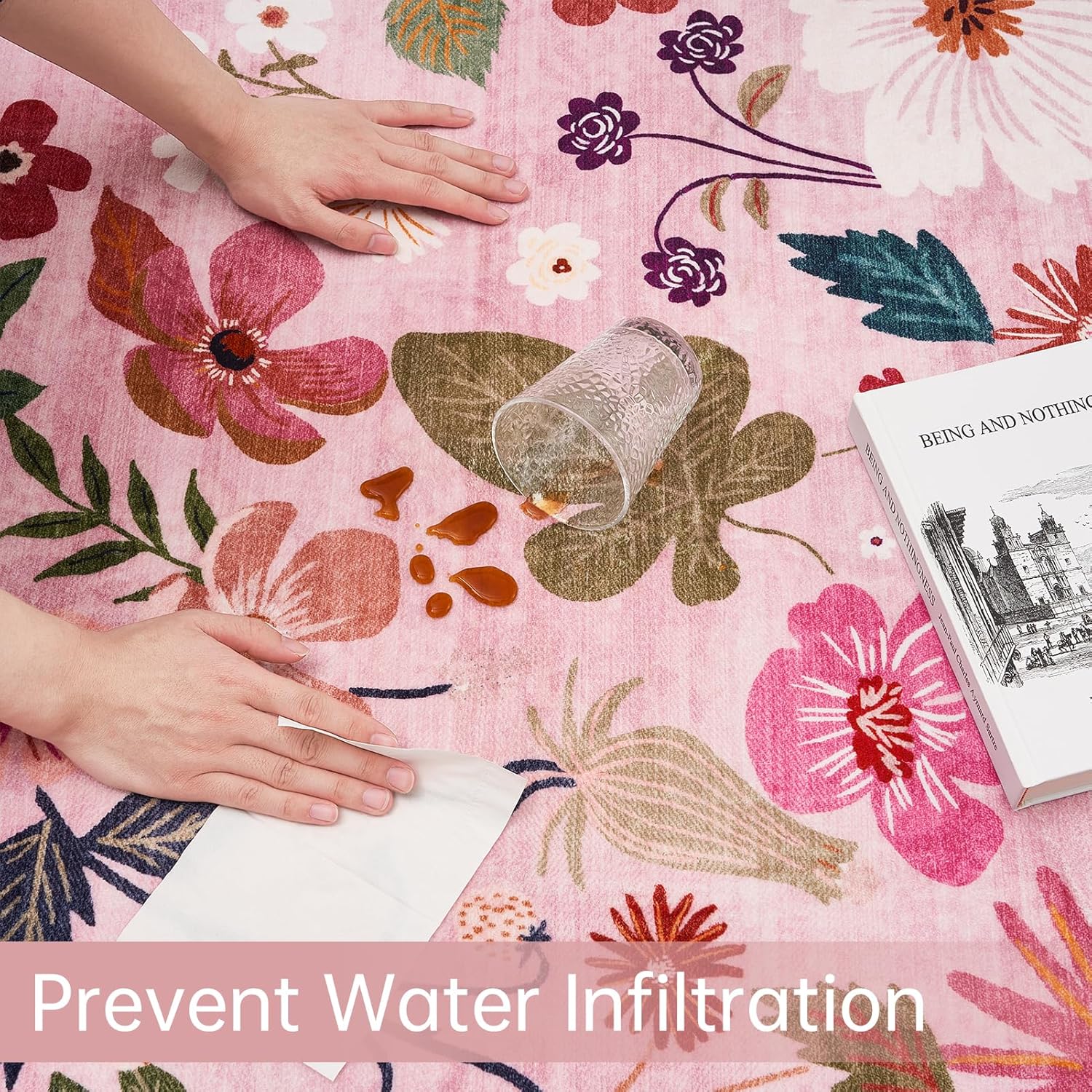 Nursery Rug 8x10 Pink Floral Rugs Boho Washable Retro Aesthetic Low Pile Non Slip Stain Resistant Large Area Rug for Girls Bedroom Living Room Dining Room Kids Playroom College Dorm Carpet