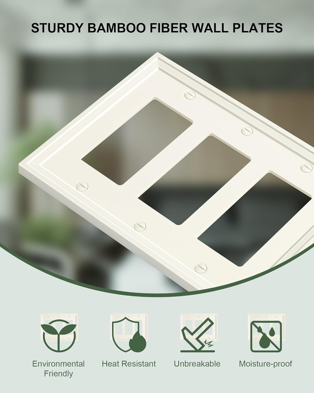 2-Pack Triple Decorator Outlet Cover Plate, Light Almond Modern Decorative Switch Plates and Outlet Covers, Natural Bamboo Fiber Wall Plates for Electrical Outlets