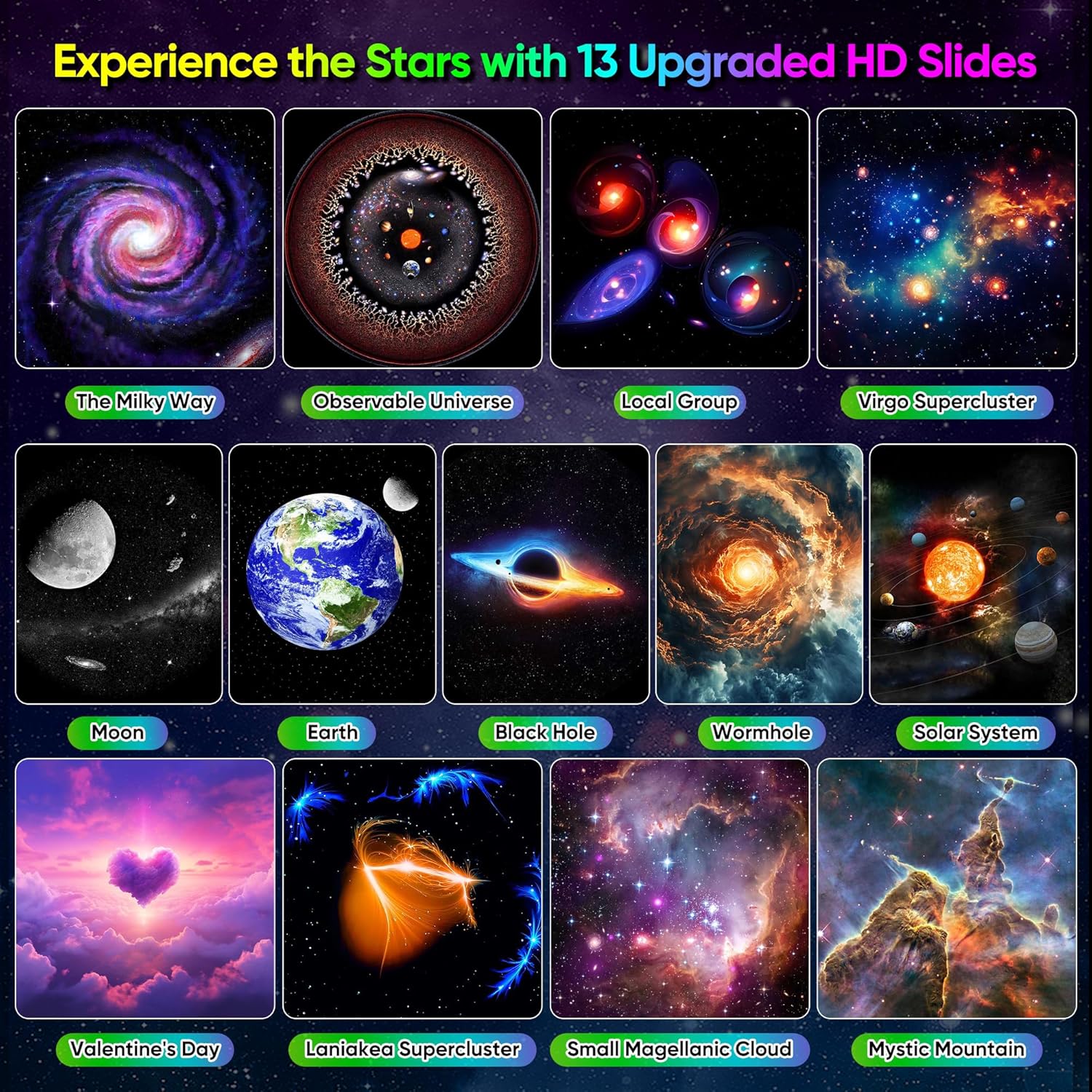 - Enhanced Galaxy Projector Experience – Elevate your bedroom decor or apartment with our upgraded galaxy projector for bedroom.This 13 in 1 HD star projector offers a mesmerizing galaxy night light projector for kids and adults alike. Immerse yourself in celestial wonders like the Solar System,Earth,Moon,and Milky Way.For the better experience, place project the galaxy projector onto the ceiling in a dark environment