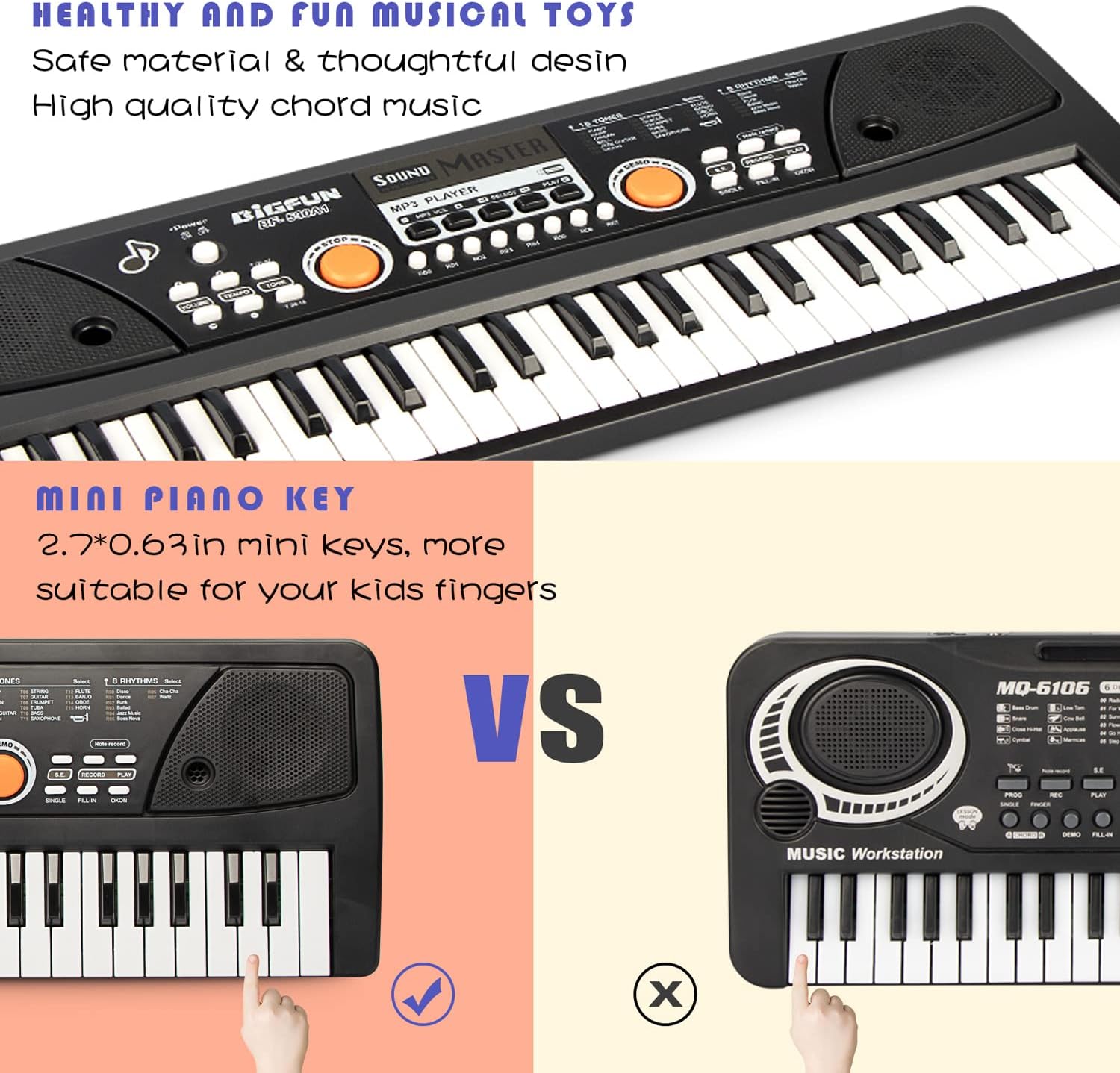 - 【Safe & Child-Friendly Design】Crafted from eco-conscious ABS material, this piano prioritizes safety with smooth edges and good keys (2.7*0.63 inches) tailored for American children. It offers a secure and comfortable musical journey for your little one, allowing them to explore and play without worry.