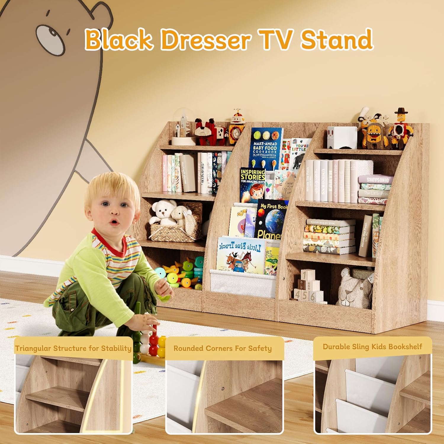 - Kids Bookshelf: A great bookshelf for kids, boys, girls, toddlers and children. This kids' bookshelf is made from high quality particle board. Designed with children in mind, the bookshelf is sized perfectly for easy access and features smooth, rounded corners to prevent accidental bumps and scrapes. With triangular structure, there will be no problem of the bookshelf tipping over and hitting the children after the installation. The thoughtfully added sling pockets feature an anti-tumble design to prevent books from slipping