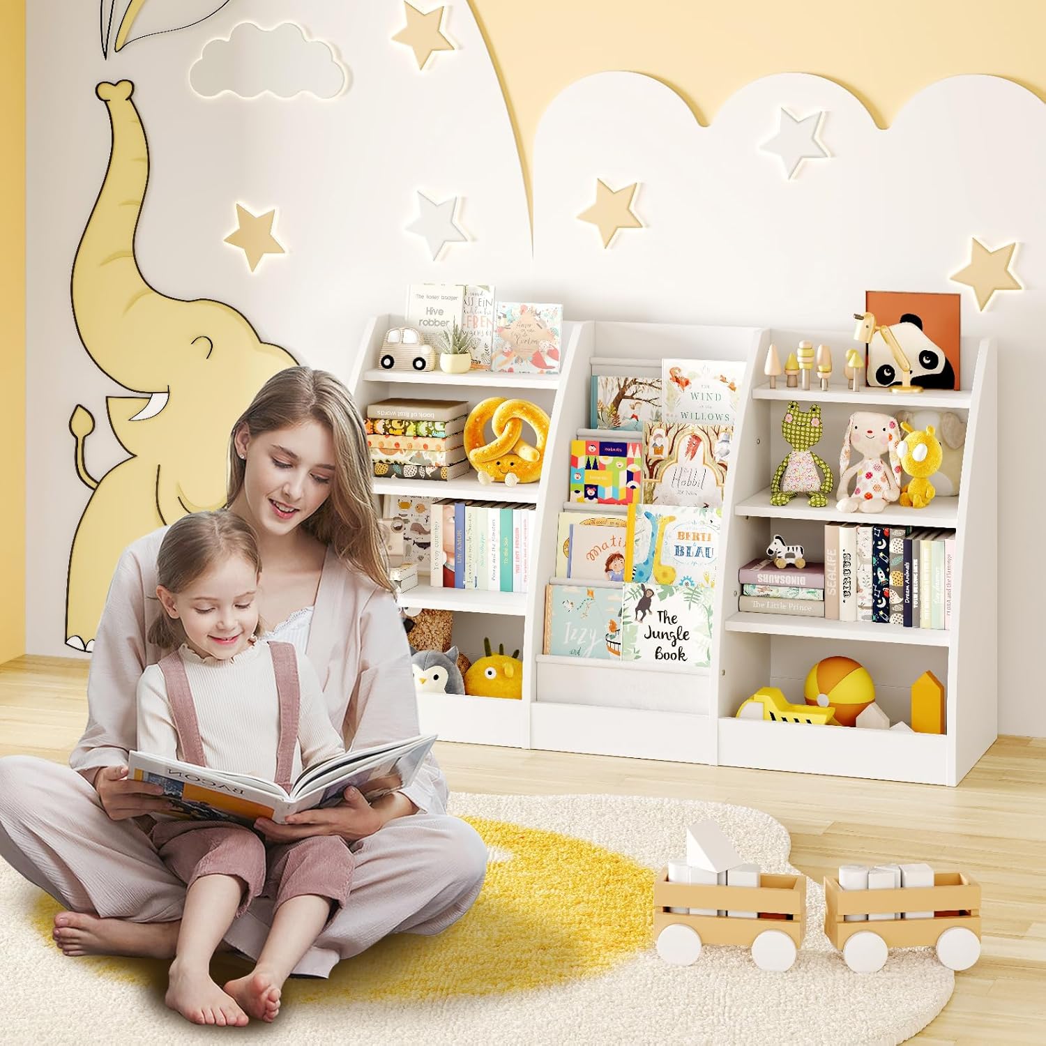 - Kids Bookshelf And Toy Storage:Tired of messy rooms? The FFBCFDK kids' bookcase helps children develop good organizational habits and keep their rooms tidy. The toddler bookshelf is large enough to hold a variety of items, including reading books, plush animals, balls, toy trucks, and more, creating a comfortable and inviting reading corner in any playroom or bedroom