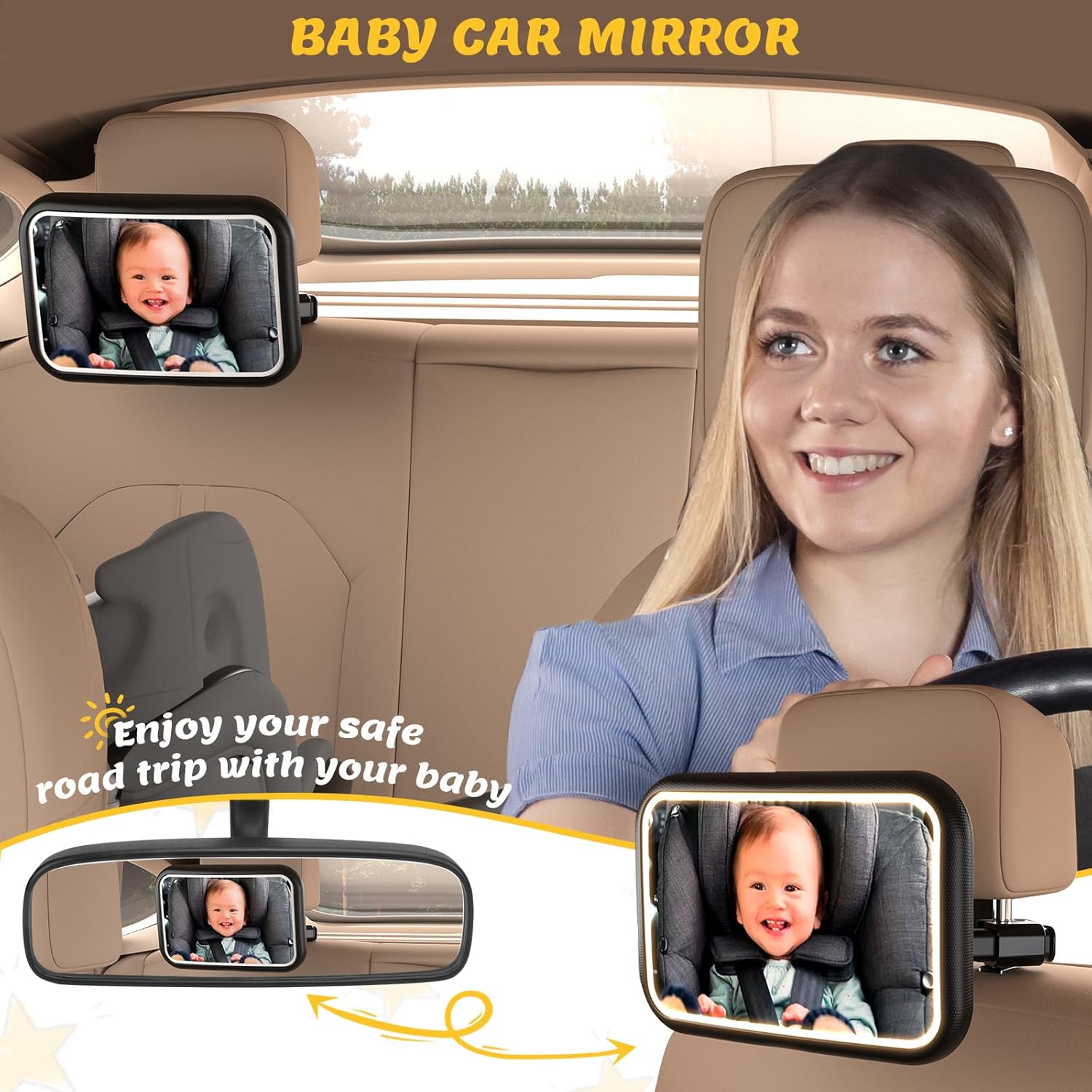 - 【Sensitivity Remote Control】This baby car seat mirror with lights is equipped with a highly responsive remote control, allowing you to easily adjust the mirror's light modles and brightness from anywhere inside the car.