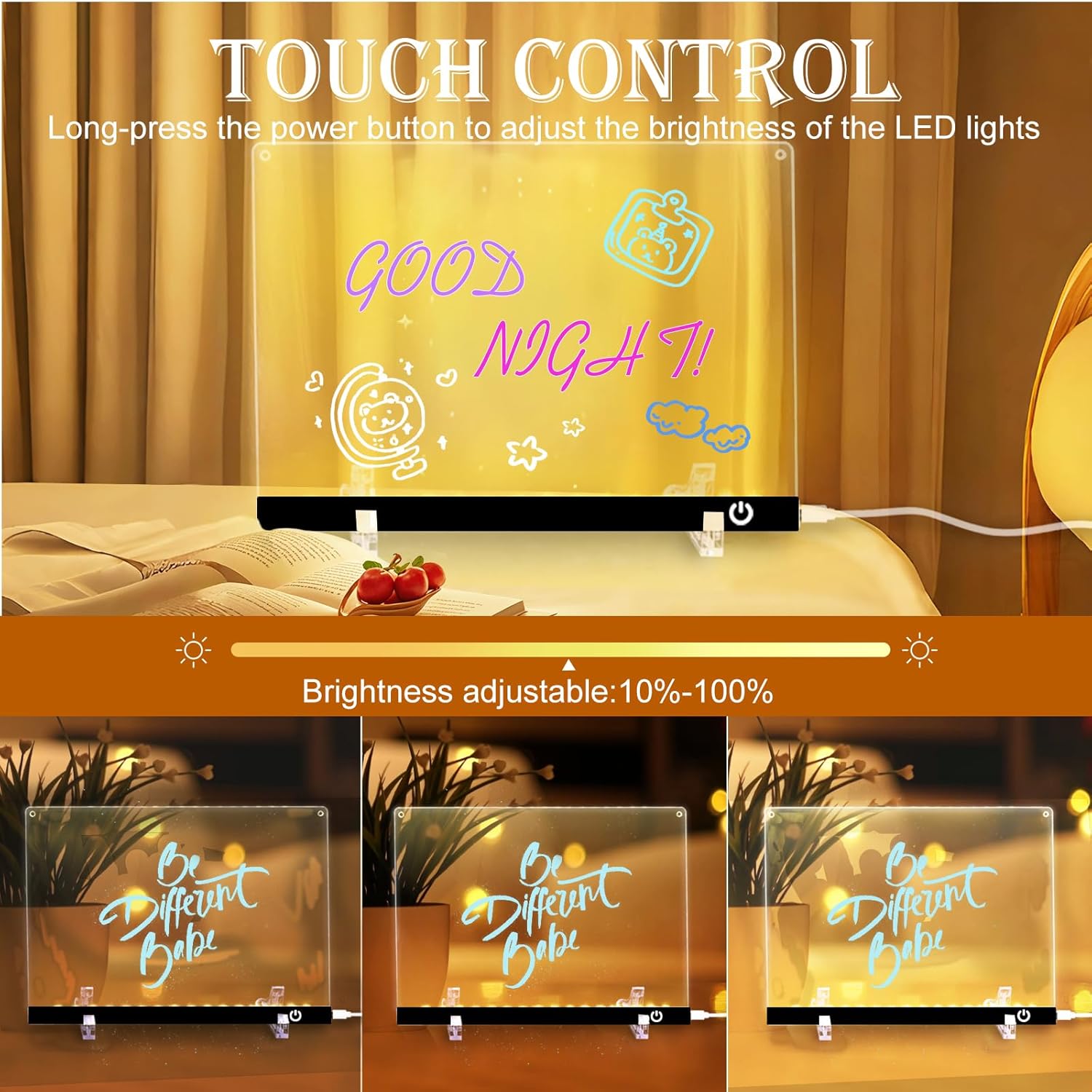 Acrylic Dry Erase Board with LED Light -11.8"x8.5" Clear Glowing Memo,Brightness Level Adjustment,12 Color Markers, Ideal for Office/Home/Kids, Writable Night Light & Desktop Charm (Black)
