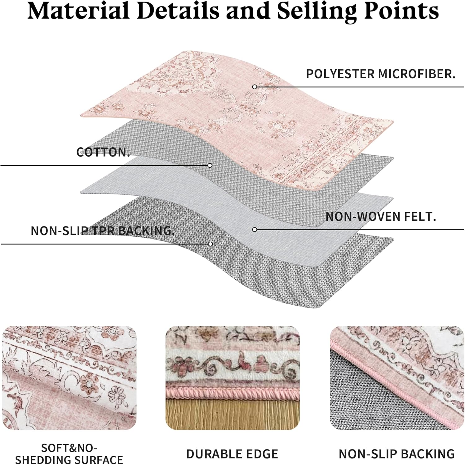 6x9 Area Rugs Washable: Oriental Soft Area Rug for Living Room Bedroom No Shedding - Low Pile Thin Carpet Rug for Dining Room Non Slip - Boho Vintage Rug for Home Decor - Soft Pink