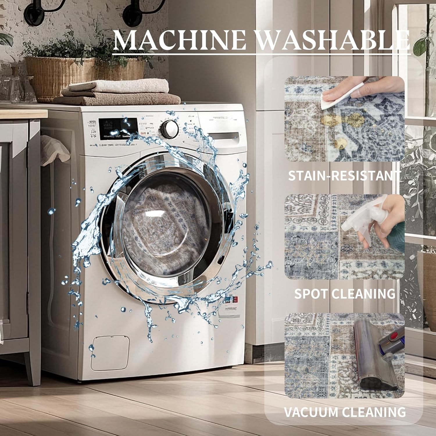 5x8 Area Rug Washable: Oriental Soft Area Rug for Living Room Bedroom No Shedding - Low Pile Thin Carpet Rug for Dining Room Non Slip - Boho Vintage Rug for Home Decor - Blue Grey