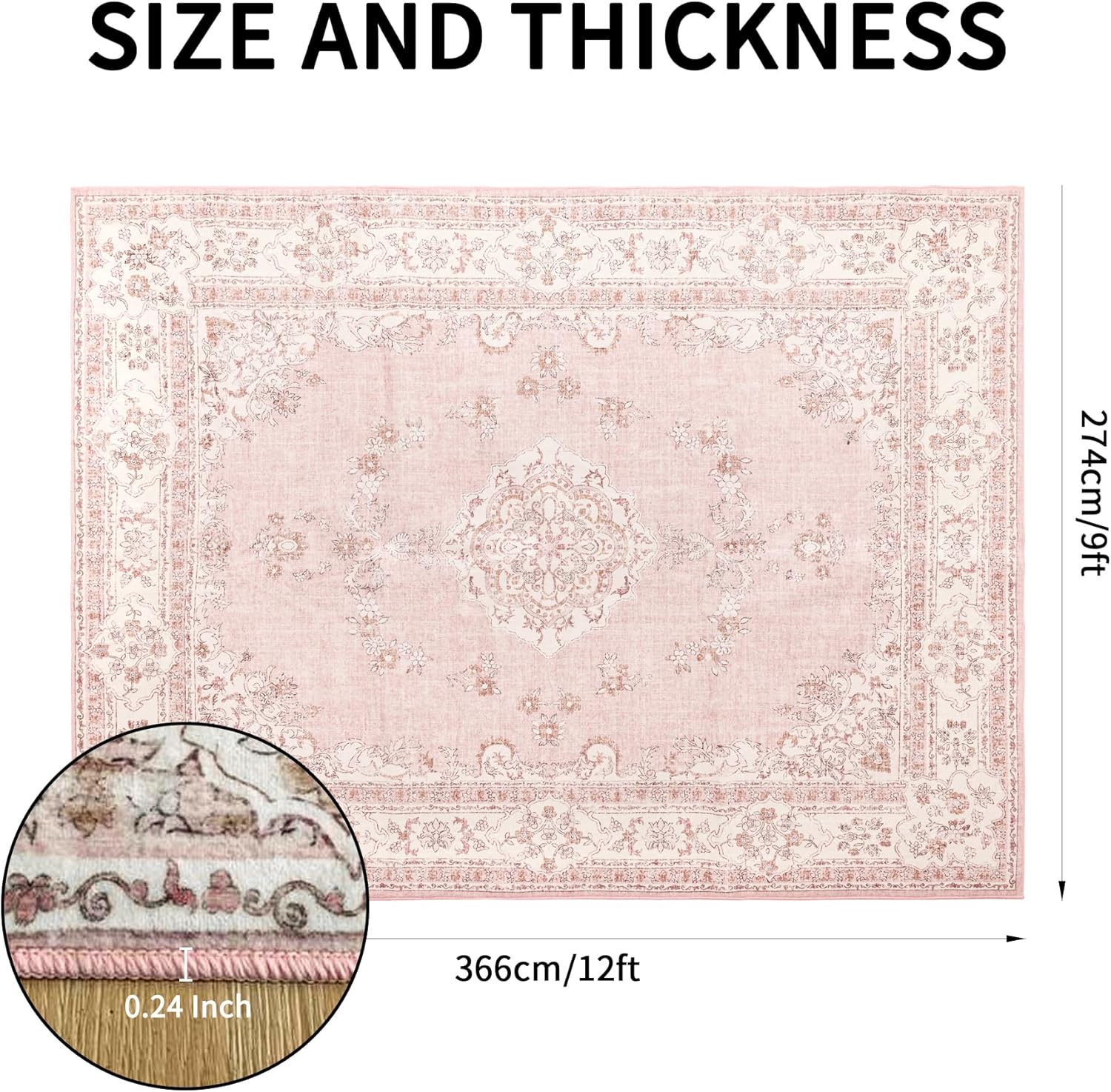 9x12 Area Rug Washable: Oriental Soft Area Rug for Living Room Bedroom No Shedding - Low Pile Thin Carpet Rug for Dining Room Non Slip - Boho Vintage Rug for Home Decor - Soft Pink