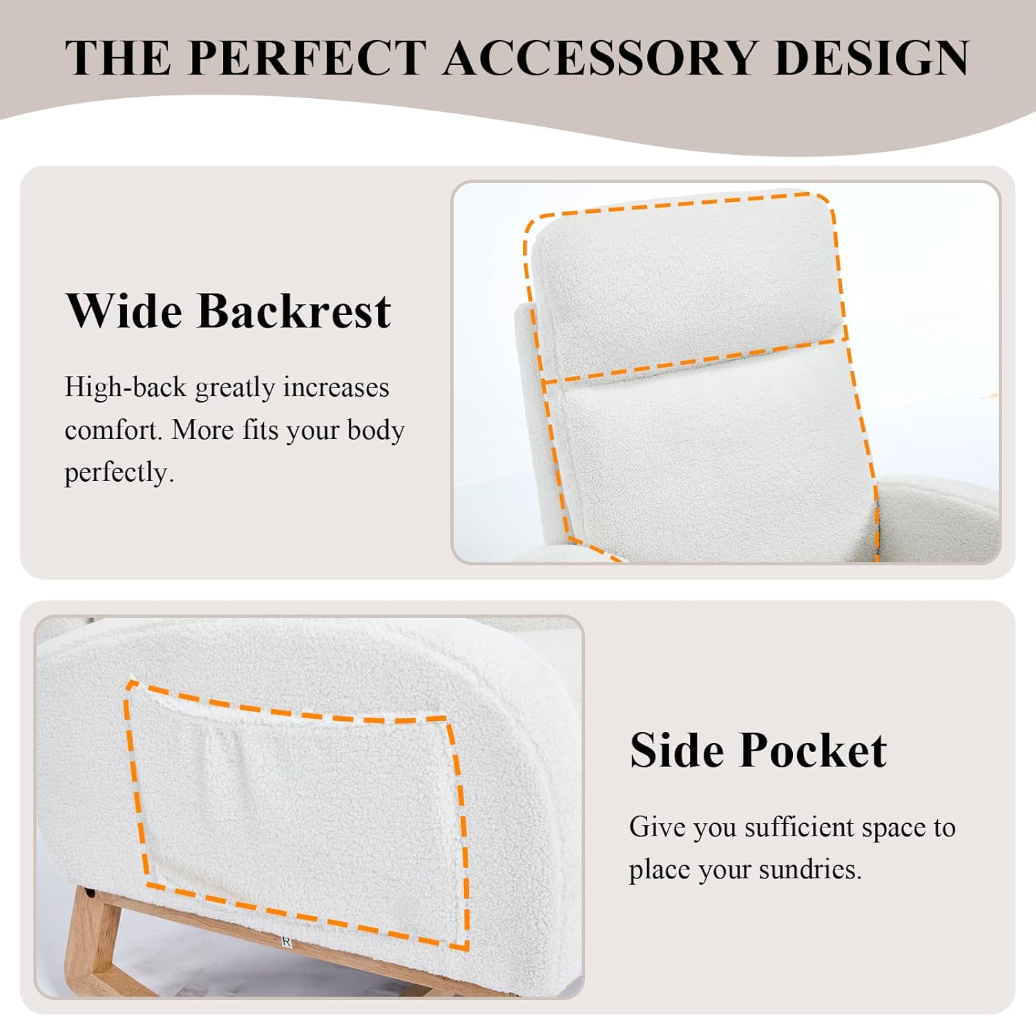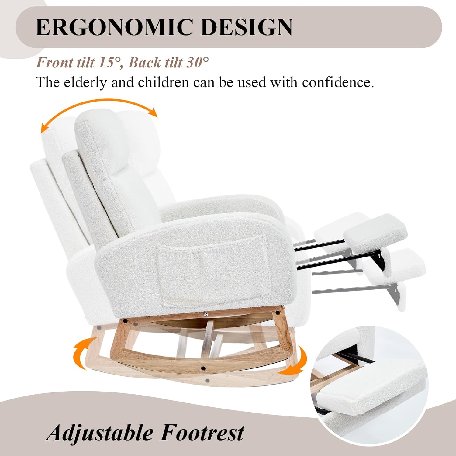 NIOIIKIT Oversized Nursery Rocking Chair, Teddy Upholstered Glider Chair with Footrest, Large Glider Rocker with Side Pocket, Rocking Accent Chair, Glider Recliner for Living Room (White Teddy)