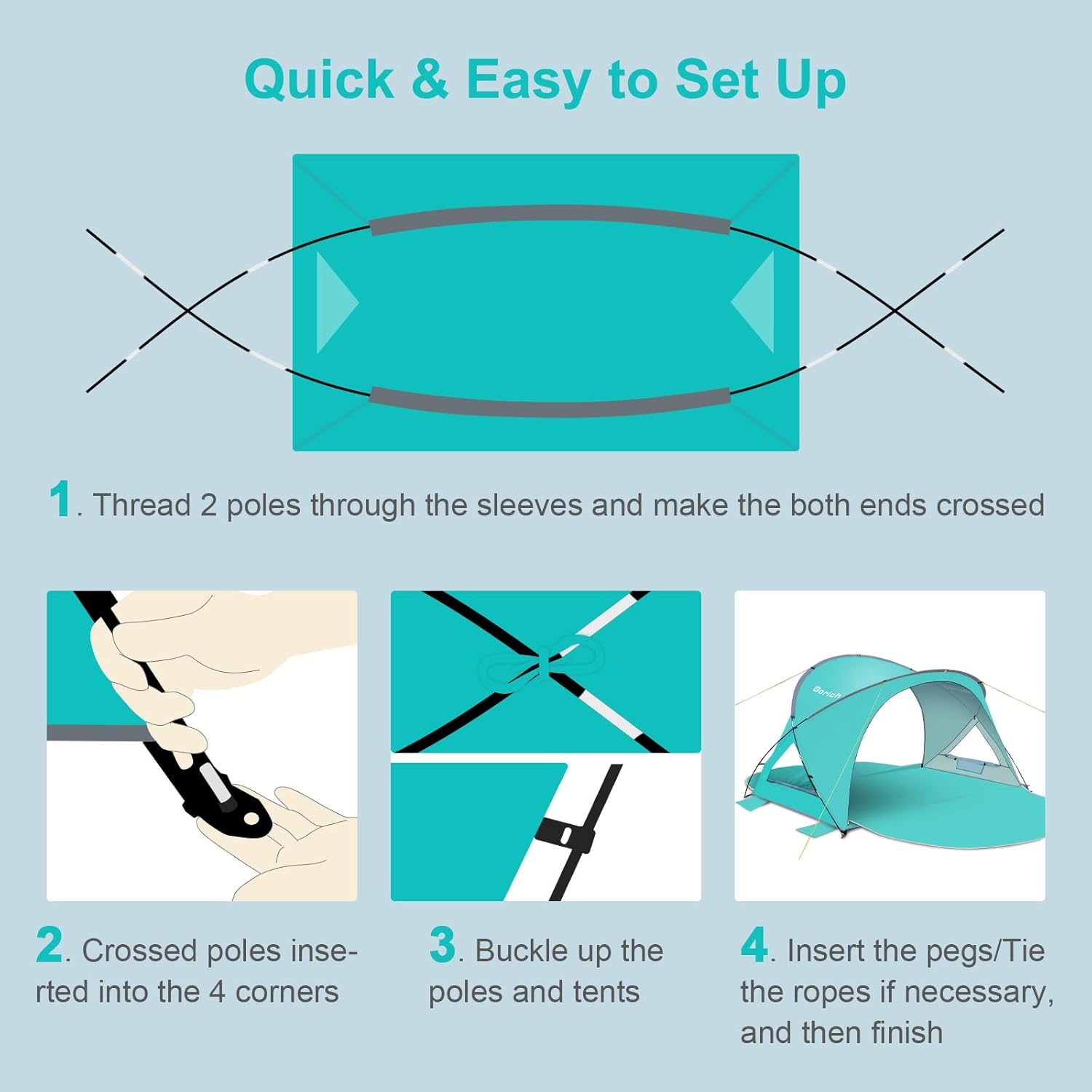 - Stable and Durable Construction: Equipped with sturdy 8.5mm thickened poles, 4 sandbags (2 on each side), 8 stakes (including 4 ground stakes and 4 plastic stakes), and 4 wind ropes, the tent can withstand 3-4 level wind forces to remain stable and secure, ensuring reliable windproof performance for your beach adventures