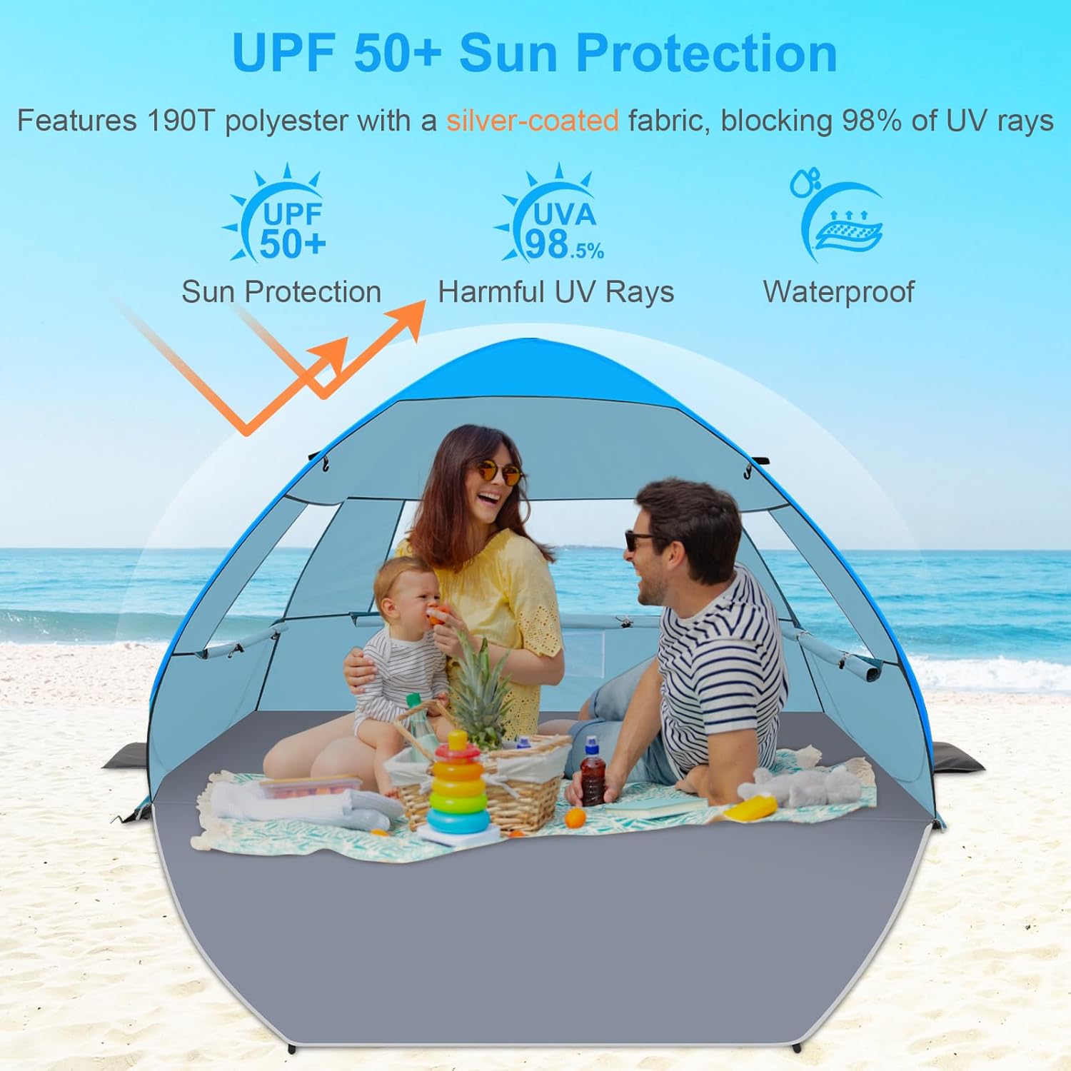 - UPF 50+ UV Protection: Crafted with high-quality 190T silver-coated fabric, this sunshade tent provides UPF 50+ protection, effectively blocking 98% of harmful UV rays. Stay protected while enjoying a comfortable shaded space