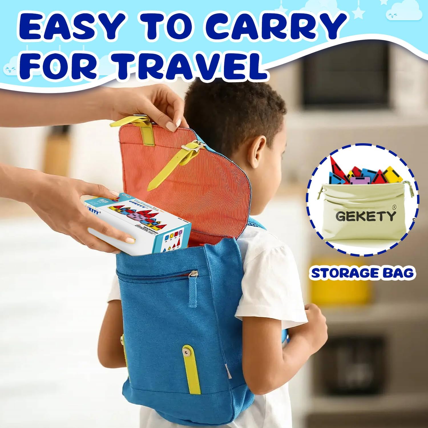 - 【On The Go Magnetic Tiles for Young Travelers】 This 32 Pcs mini magnetic tiles set is a travel essential for a family trip that creates unforgettable surprises for you and your little one! Designed with 1.5-inch tile, a custom-designed storage box, also comes with a portable storage bag, no need to worry about the weight, it can be easily put into a school bag, backpack, or carry-on bag. It is a great travel toy idea for toddlers’ trips!