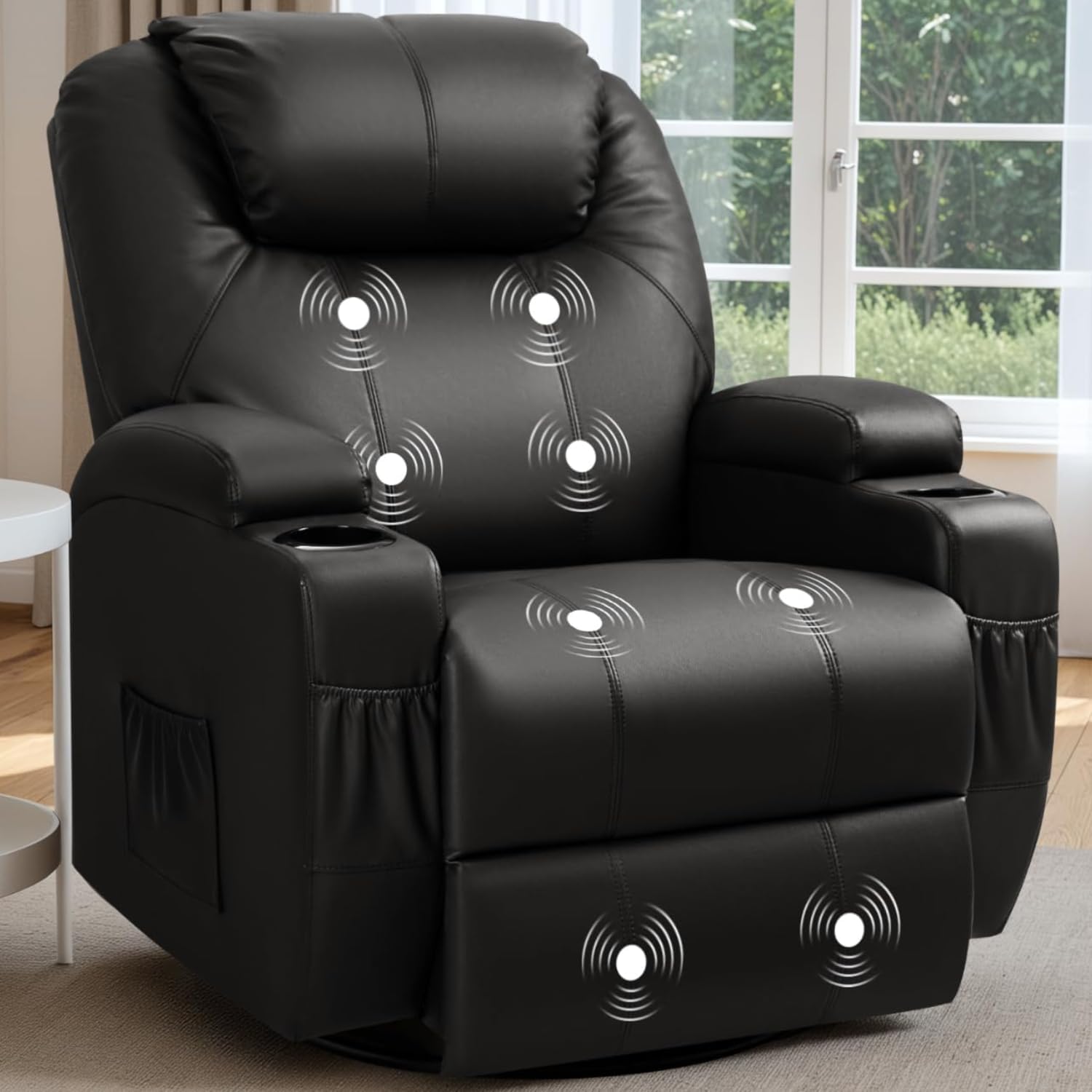 Recliner Chair, 360° Swivel Rocker Chair for Adults, Rocking Recliner Chair with Massage, Comfy Single Sofa with Side Pockets Cup Holders for Living Room, Bedroom, Nursery (Leather, Black)