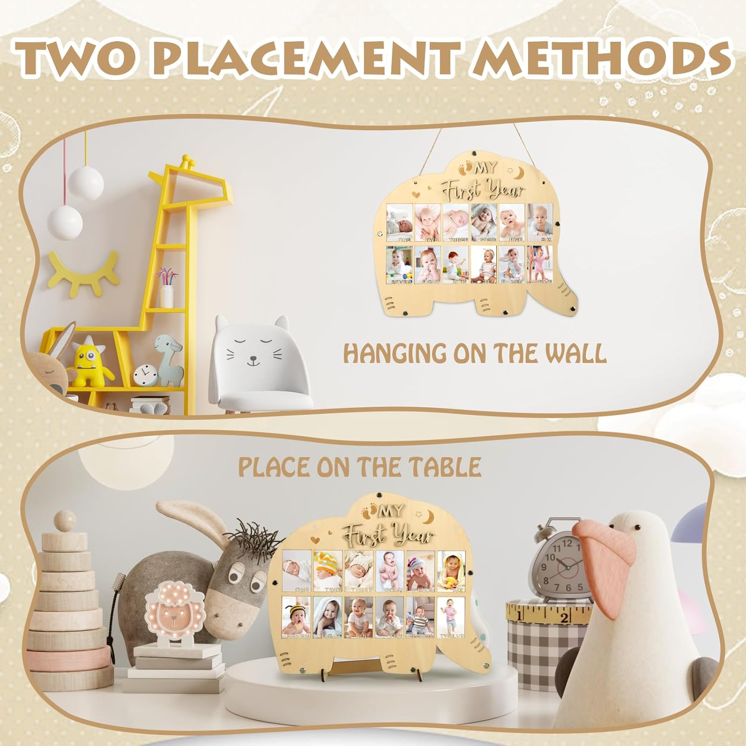 My First Year Picture Frame,One Year Of Photo Board, Baby's First Twelve Months Photo Collage and Gender Neutral Keepsake, Ideal for Baby Shower,New Mom Keepsake Gift and Nursery Decor - With Stand (Elephant sign)