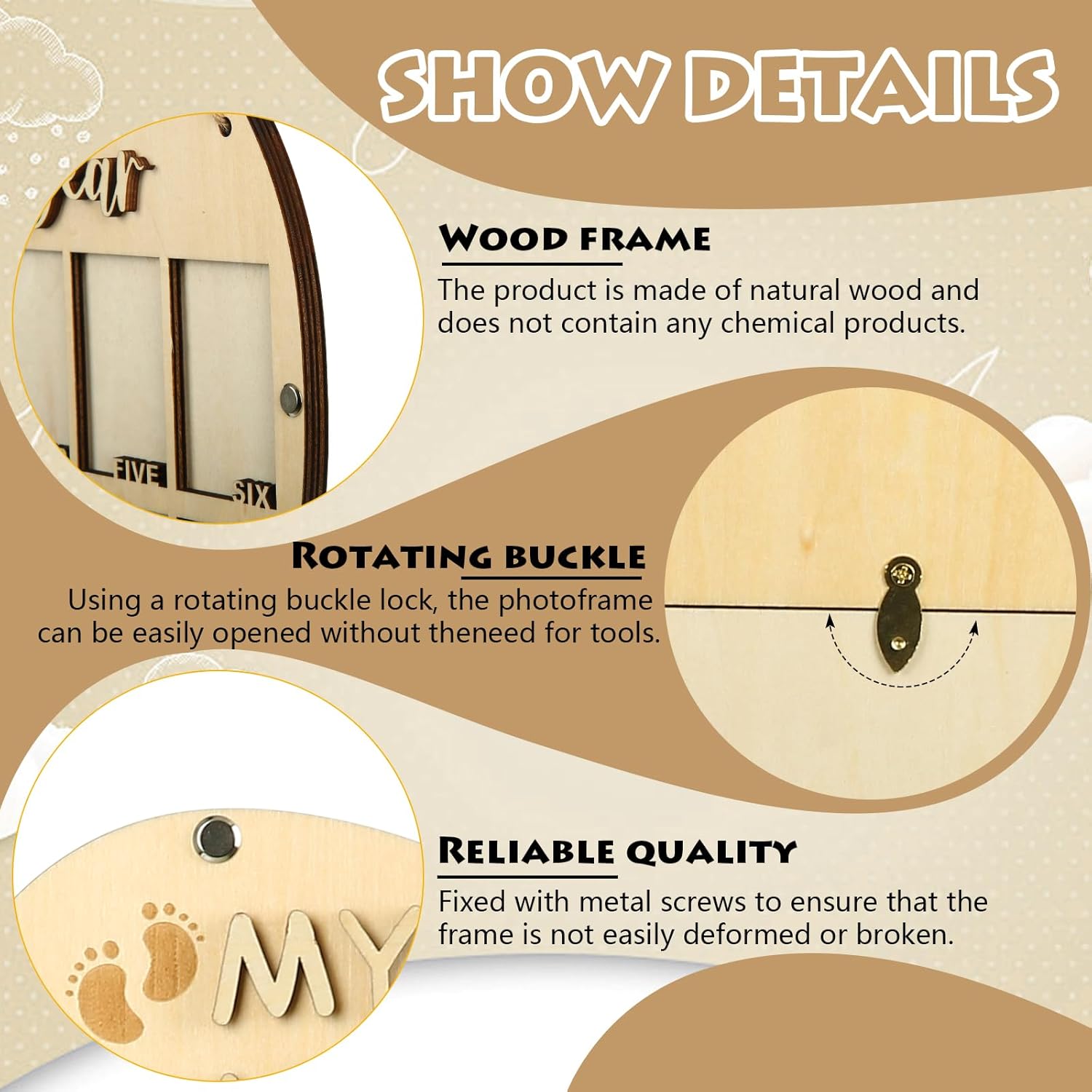 - SIZE & MATERIAL: My first year milestone board size 11.9" high x 13.4" wide, made from 2/5" thick premium wood,smooth and reusable,not easy to fade or peel.fits 1.8" x 3" photos (Wallet Size),easy to use.