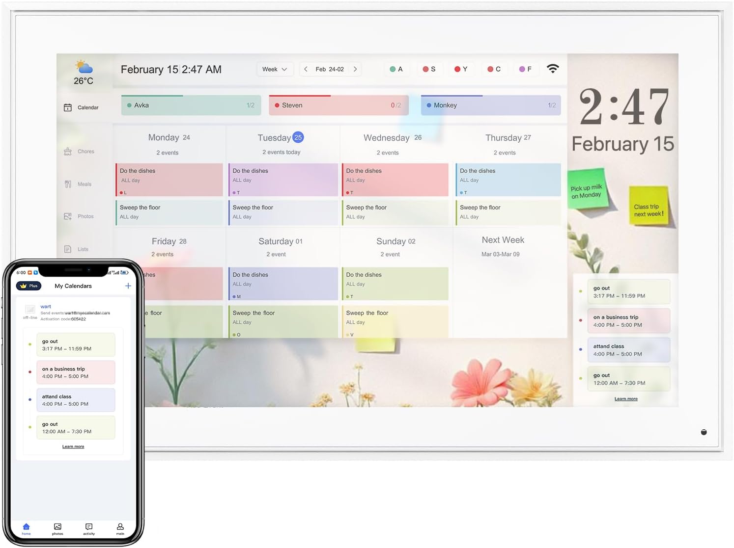 - ✍User-Friendly Interface: Our Digital Calendar boasts a clean and intuitive design, with 15.6" FHD touchscreen. making it easy for anyone to navigate and use, managing your time has never been simpler. Use different colors to categorize your events (work, personal, appointments), so you can quickly identify what’s on your agenda at a glance. Installation method can choose wall mount or Standing on the table.