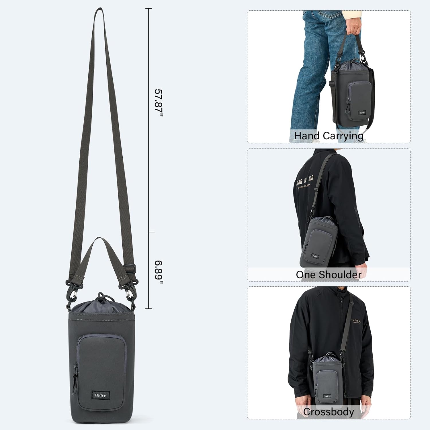 - [Water Bottle Holder with 2 Straps] Water bottle sling bag has 2 detachable and adjustable straps. One can be used as a top handle to hang on other objects such as luggage handle or backpack strap for hands-free convenience, while the other can be adjusted in length (28" to 58") for various carrying methods such as handbag, shoulder bag, sling bag, crossbody bag and so on.
