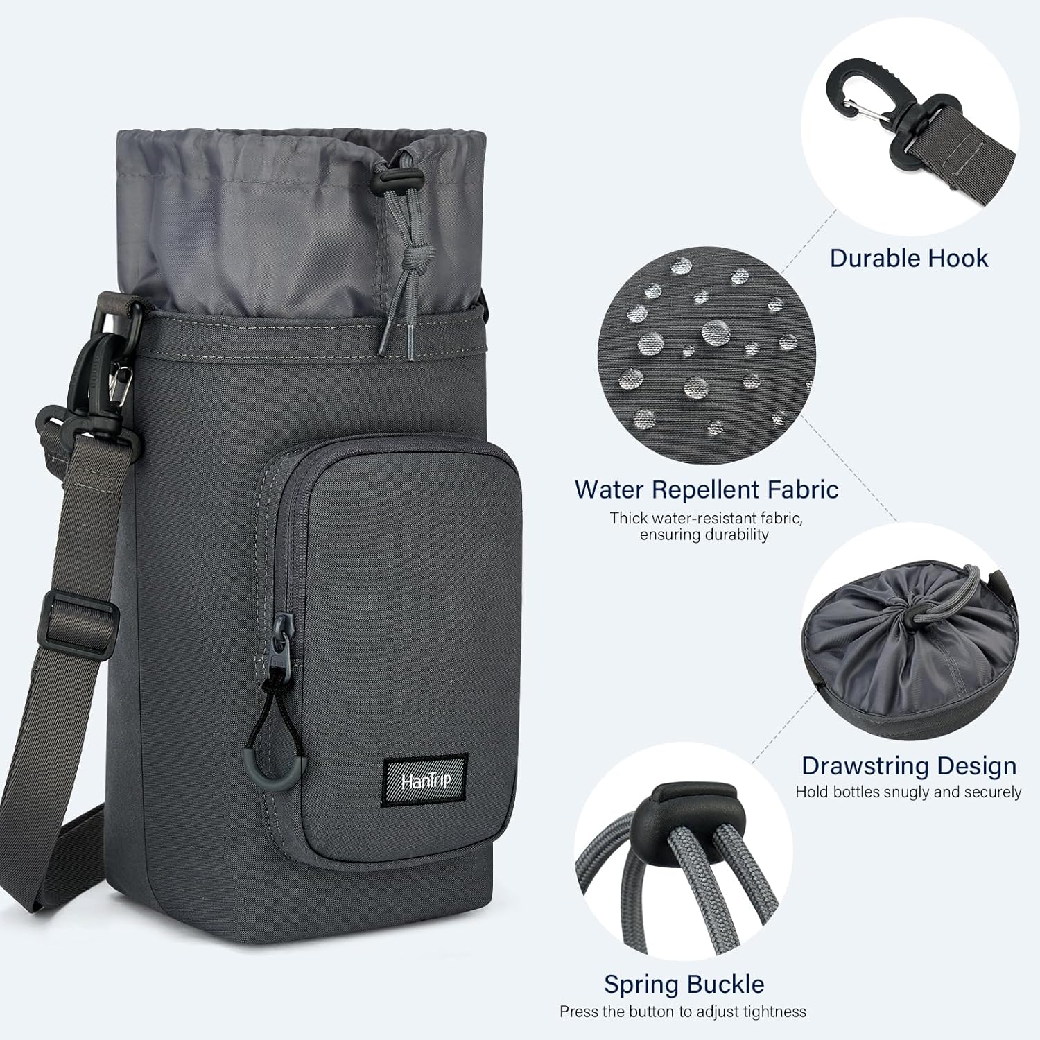 - [Insulated Water Bottle Bag] This water bottle holder adopts insulation lining for extraordinary heat or cool preservation. Crafted with water-resistant polyester fabric, smooth zippers and reinforced seam, the water cup holder features drawstring closure to hold bottle securely and spring buckle to adjust tightness. Long-lasting durability is guaranteed.